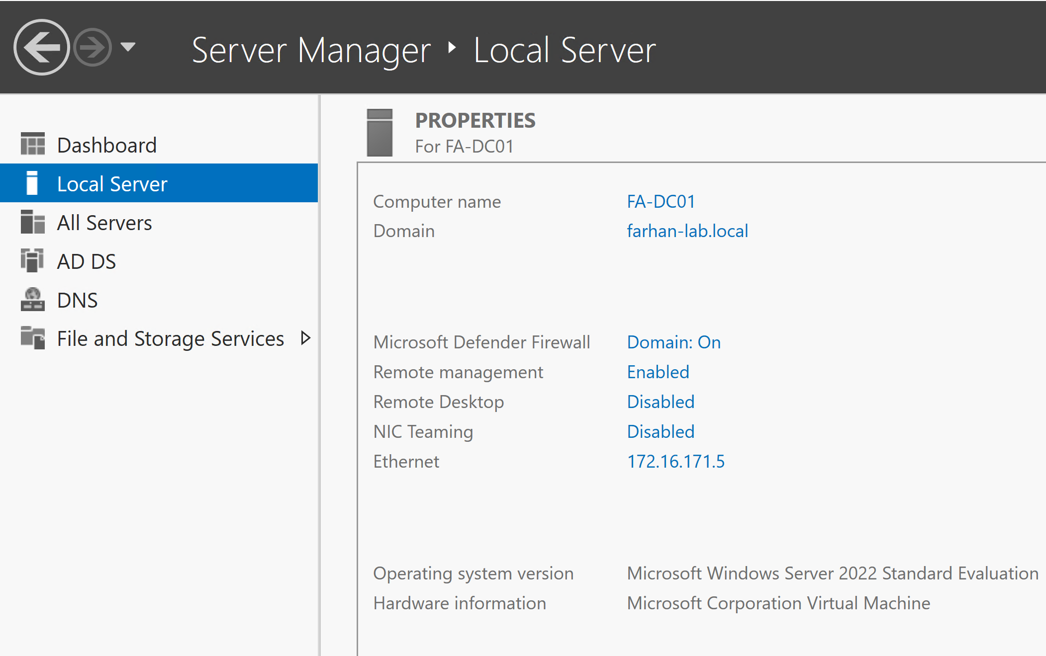 - Preferred DNS Server: 172.16.171.5 (FA-DC01)