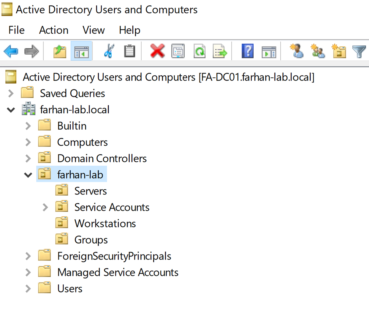 Created an OU structure suited for my lab. This is optional, but I prefer creating a dedicated root OU so GPO scope is clean.