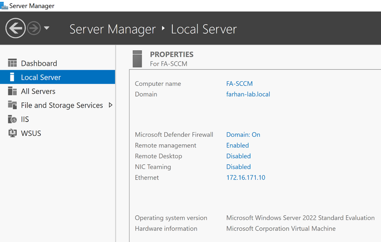 | FA-SCCM | SCCM Site Server + SQL Server | 172.16.171.10 |