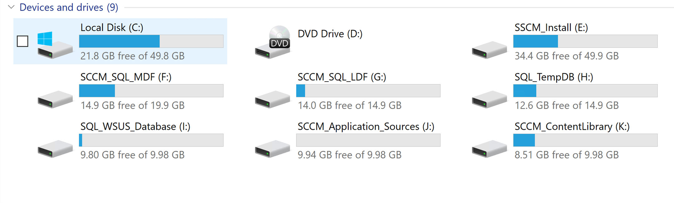 | SCCM_INSTALL | 50GB | Configuration Manager application and log files |