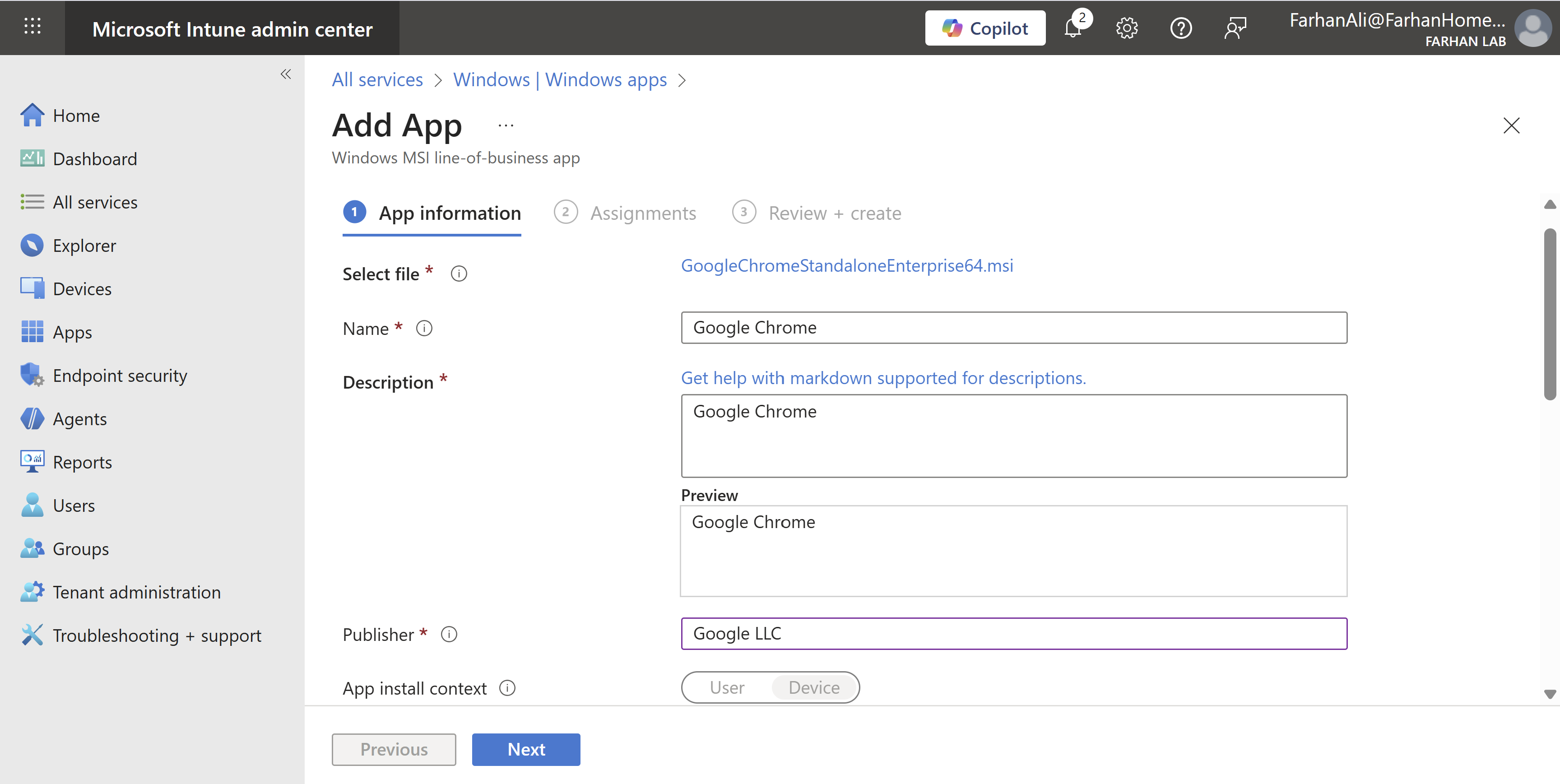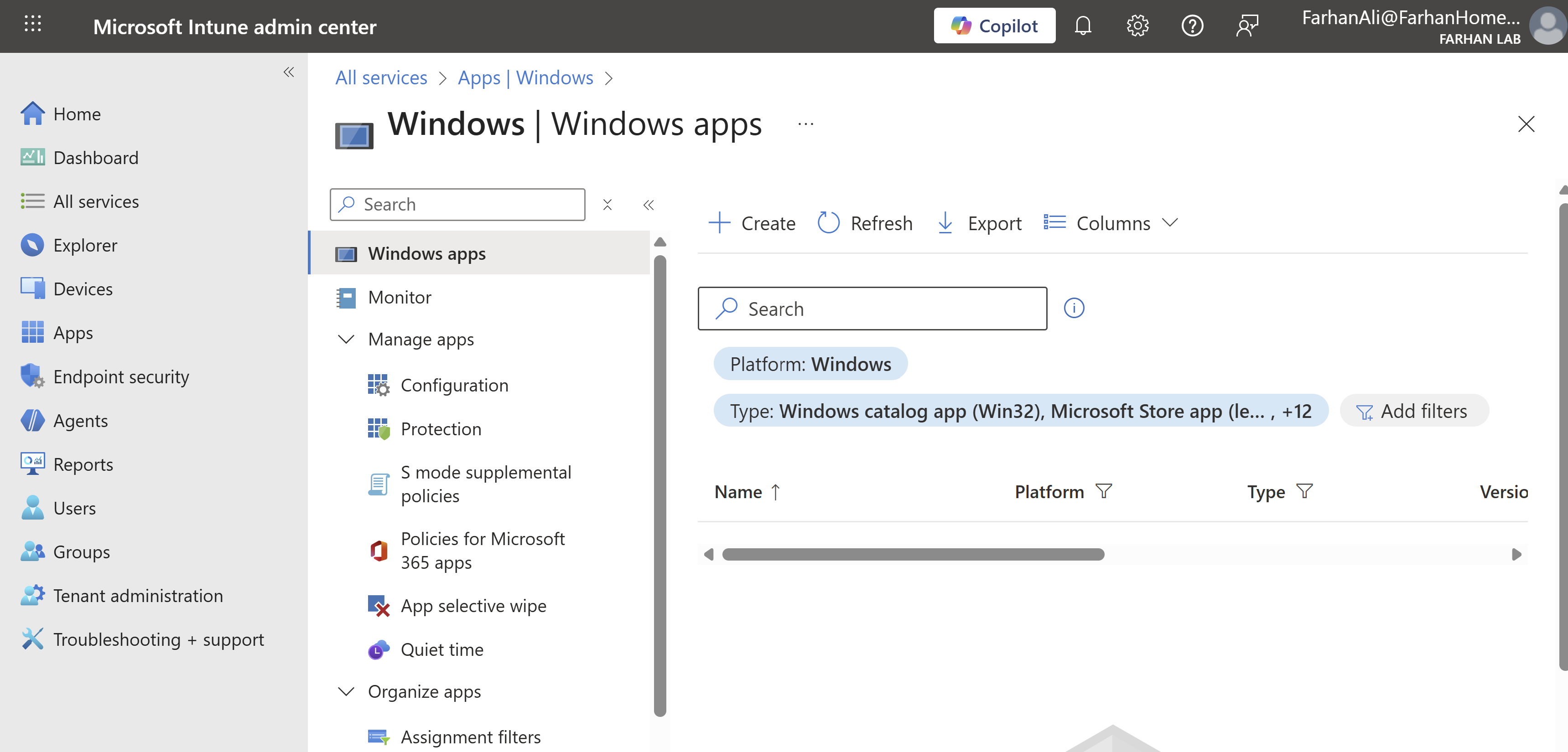 Navigate to Microsoft Intune admin center → Apps → Windows → Create