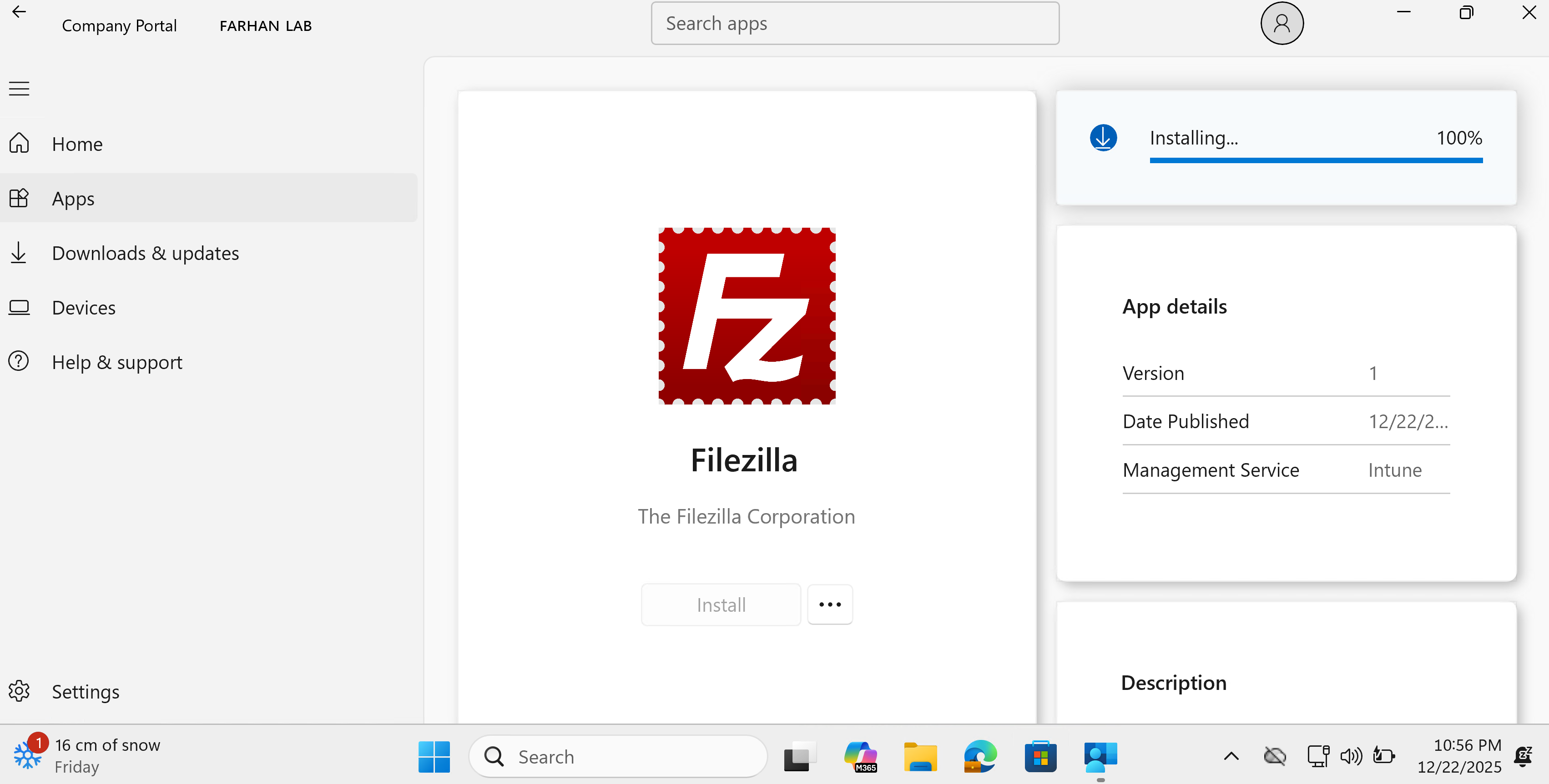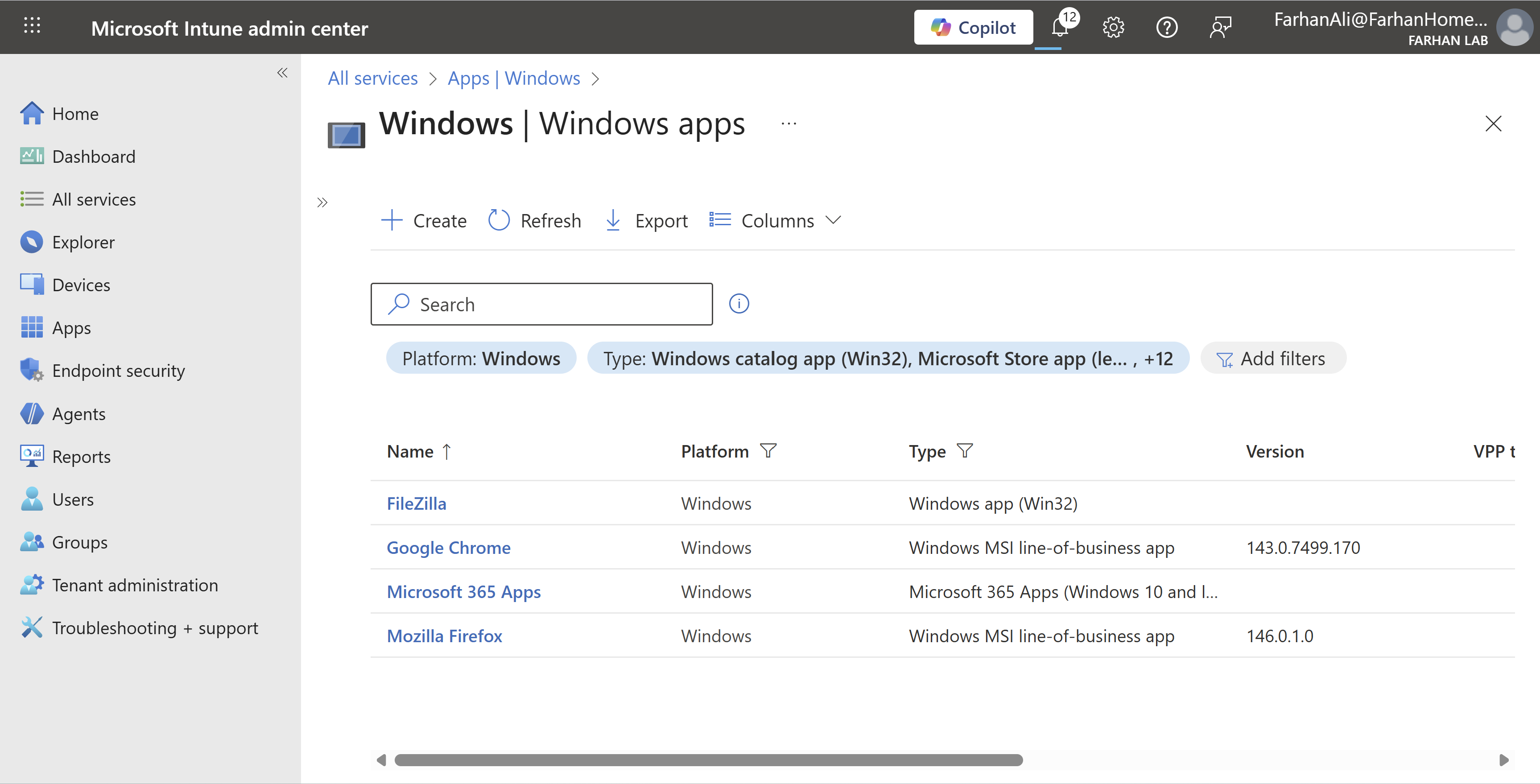 Verify app creation and add additional apps using the same method. I added FileZilla which is a Win32 app so I had to convert the installation file into .intunewin format using Microsoft Win32 Content Prep Tool before uploading it to intune.