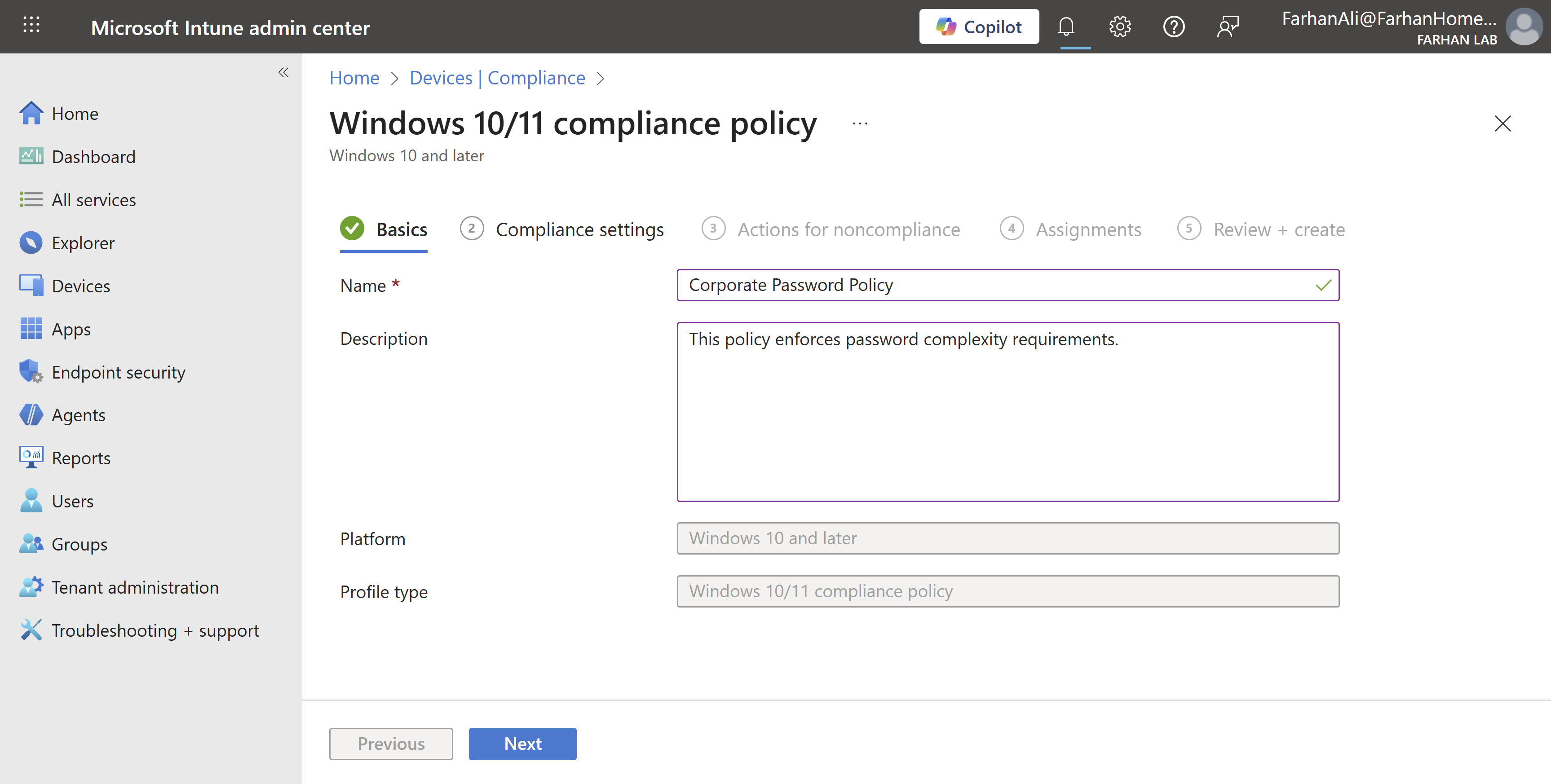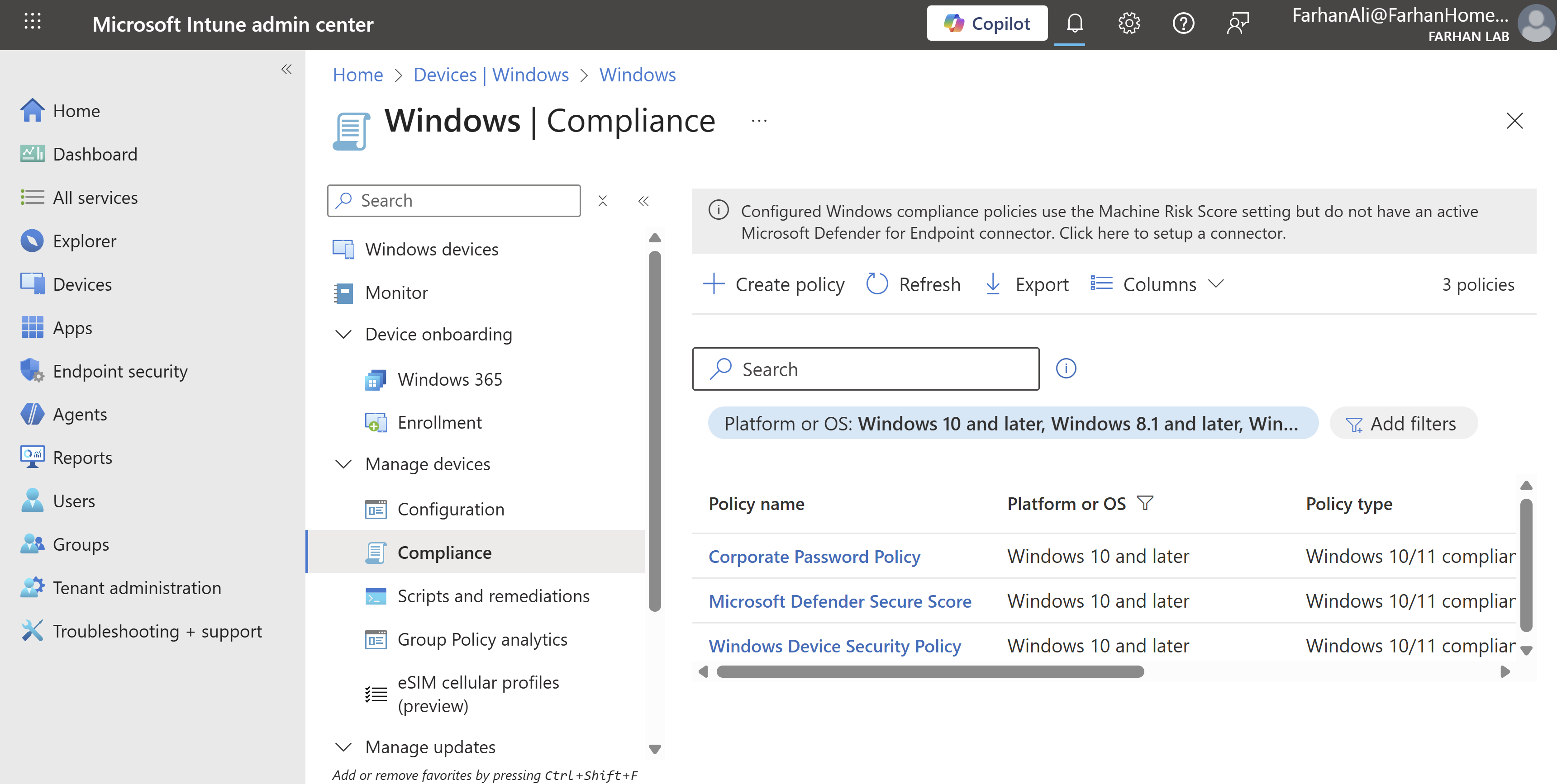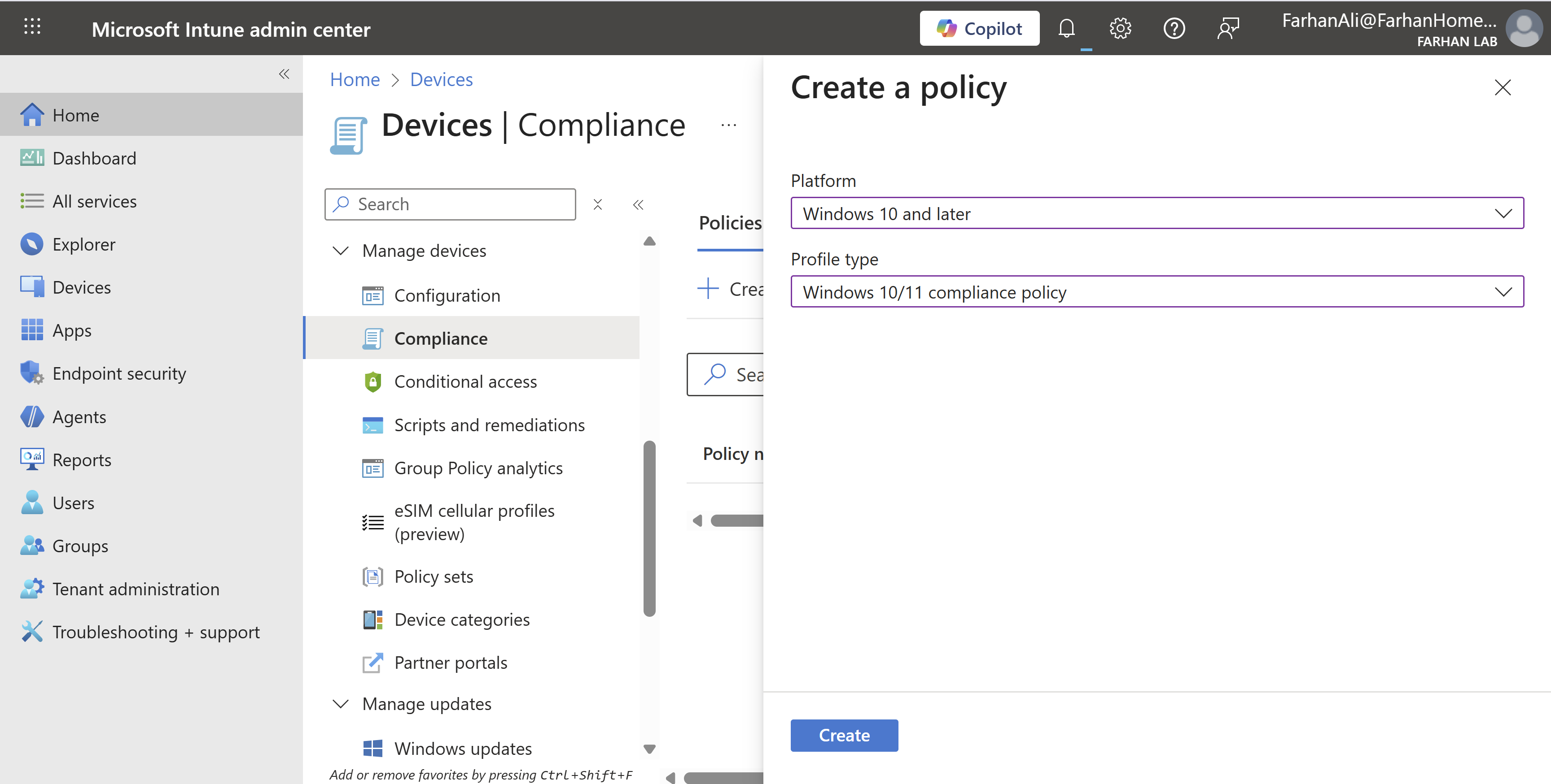 Navigate to Microsoft Intune admin center → Devices → Compliance → Create Policy