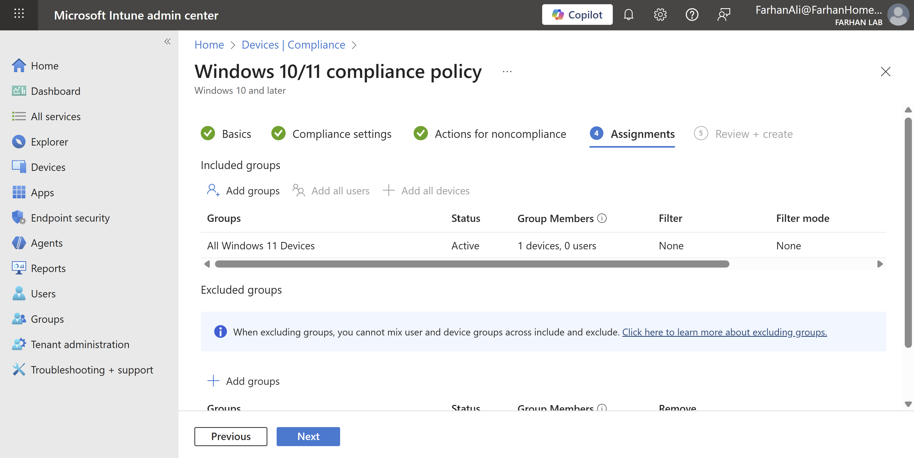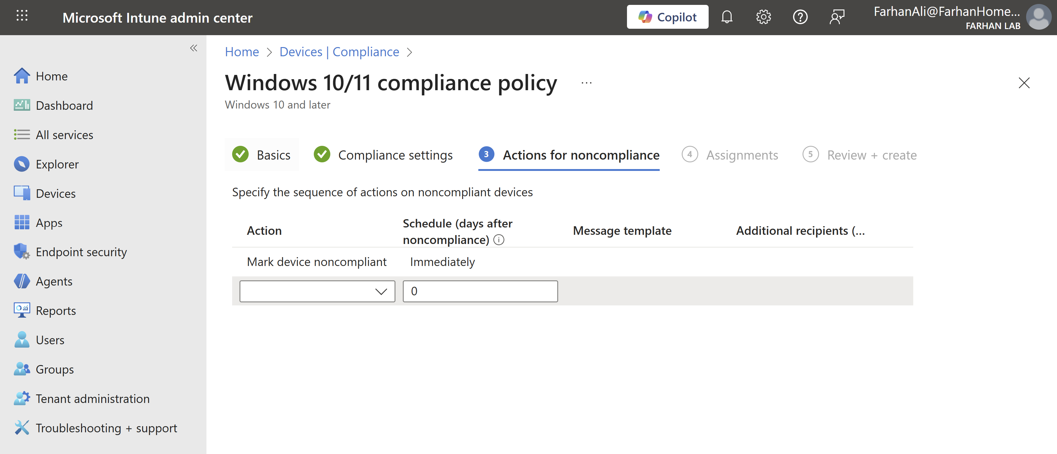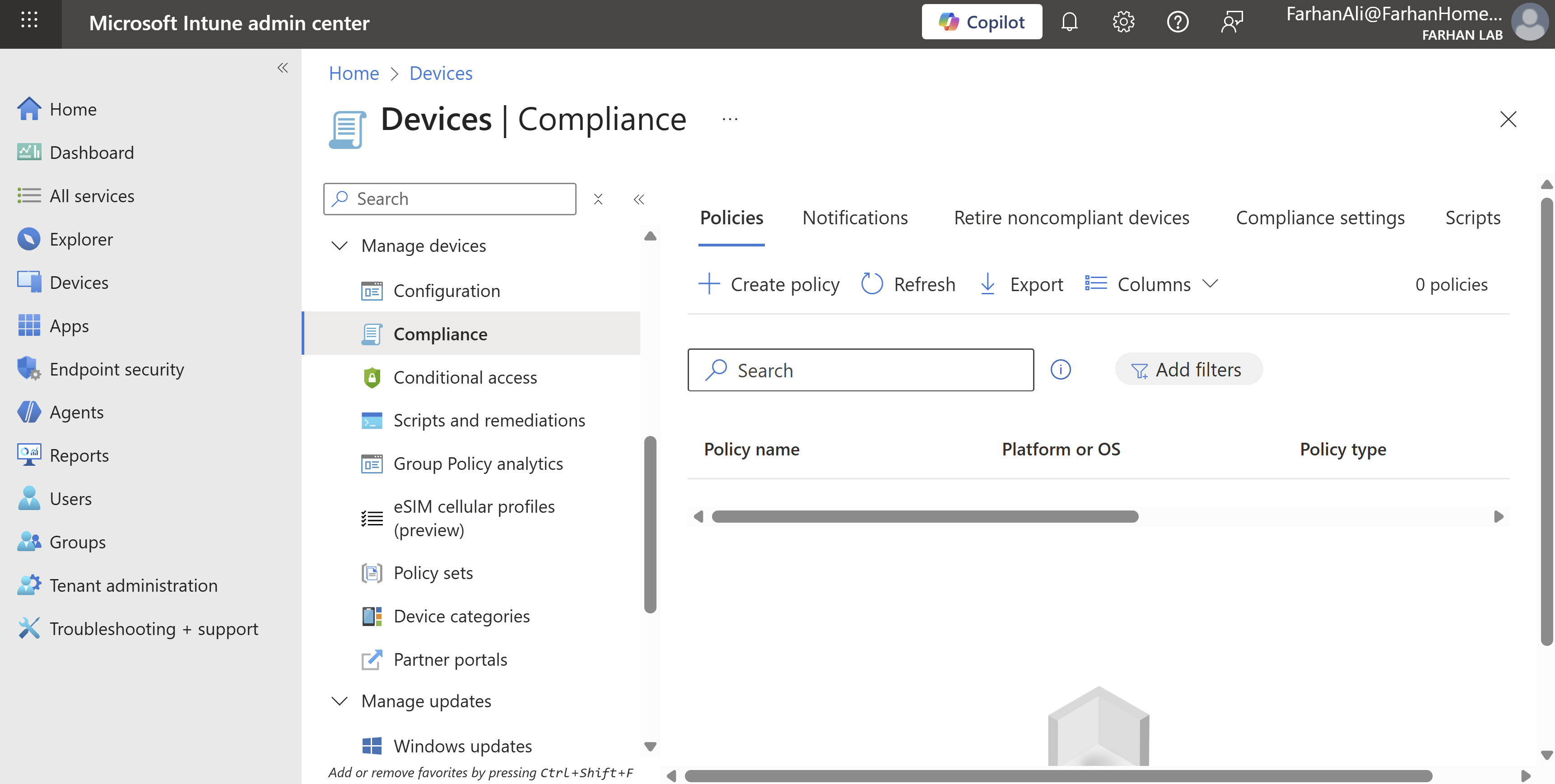 Navigate to Microsoft Intune admin center → Devices → Compliance → Create Policy