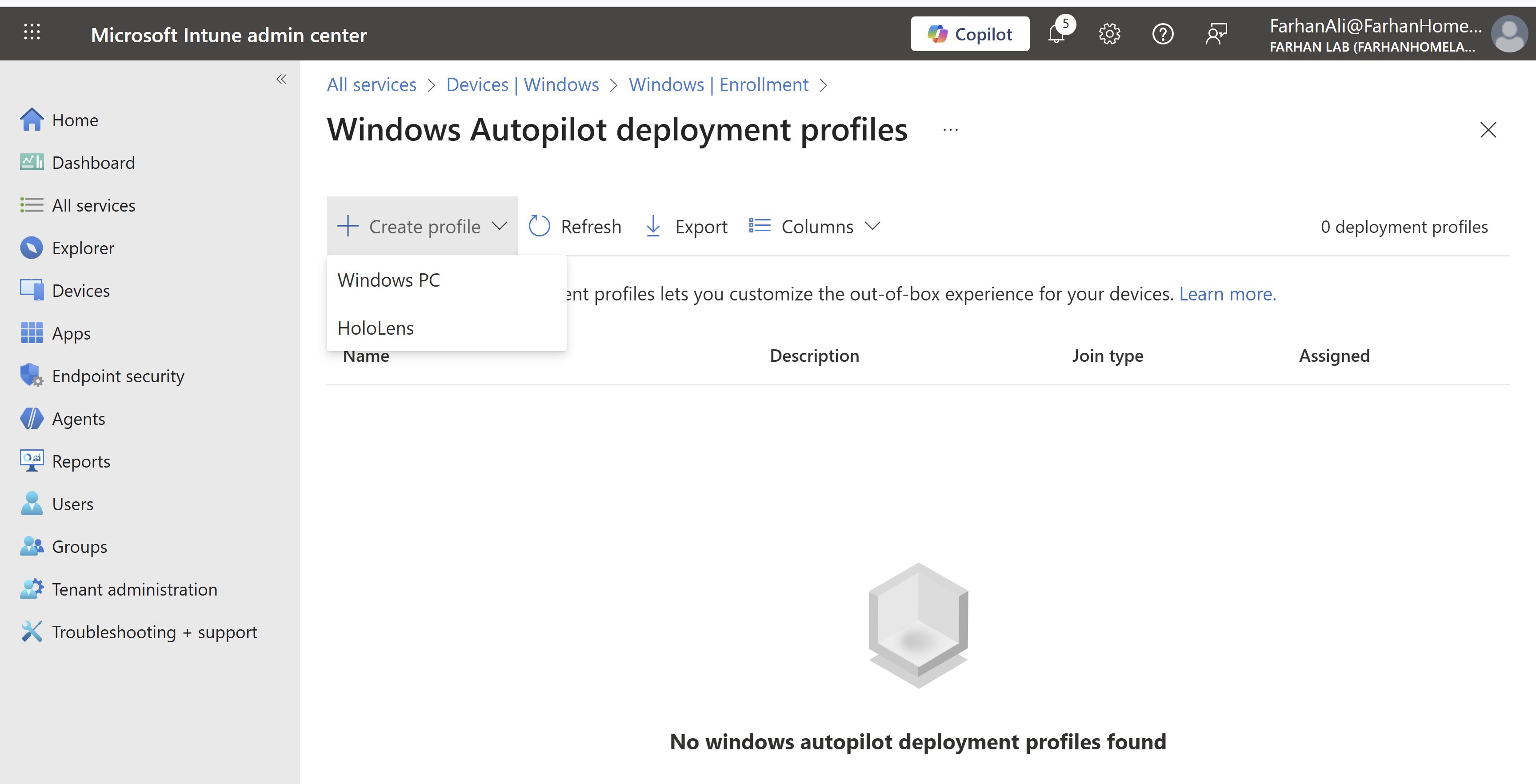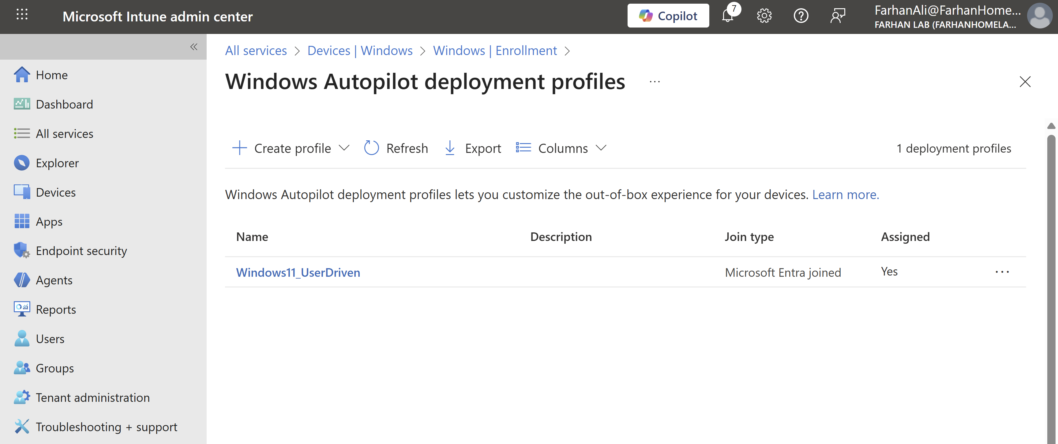 Navigate to Microsoft Intune admin center -> Devices -> Windows -> Enrollment -> Deployment profiles under Windows Autopilot