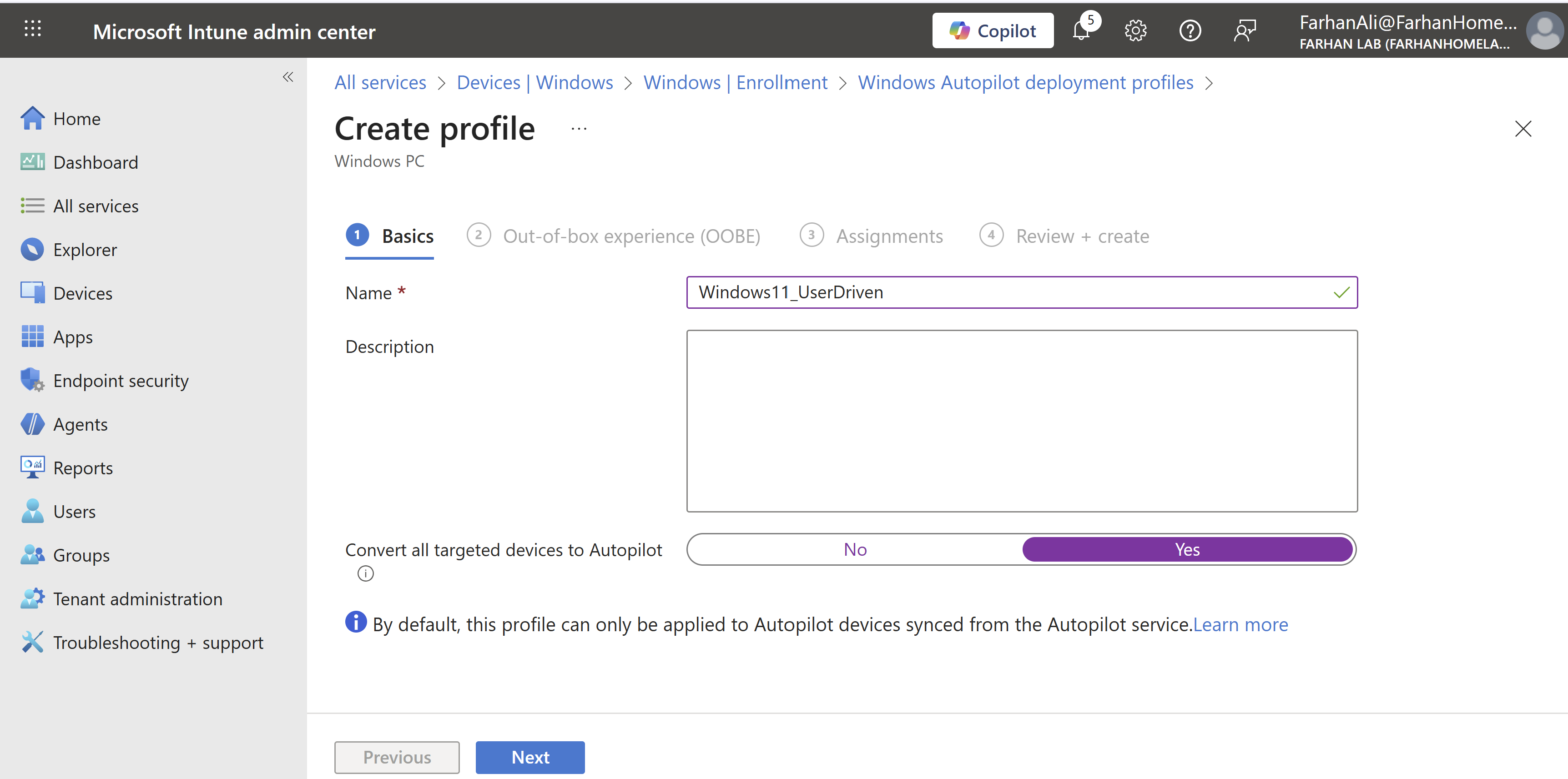 Created a Windows PC profile and checked the option to “Convert all targeted devices to Autopilot” to automatically register existing, non-Autopilot Windows devices in All Windows 11 Devices group to the Windows Autopilot service.