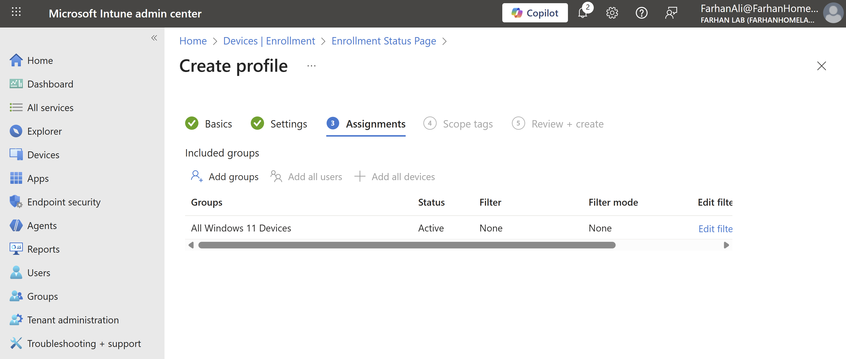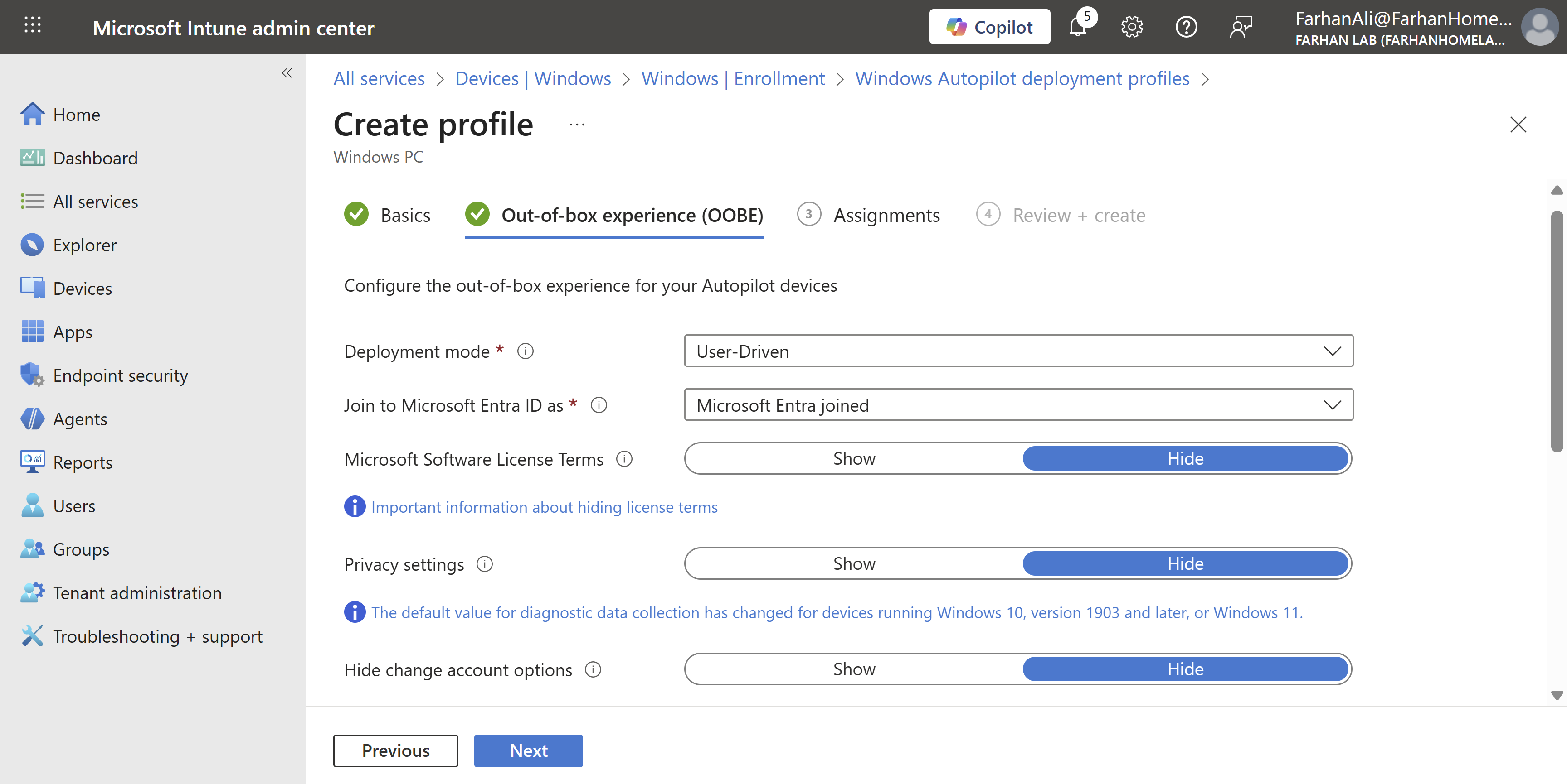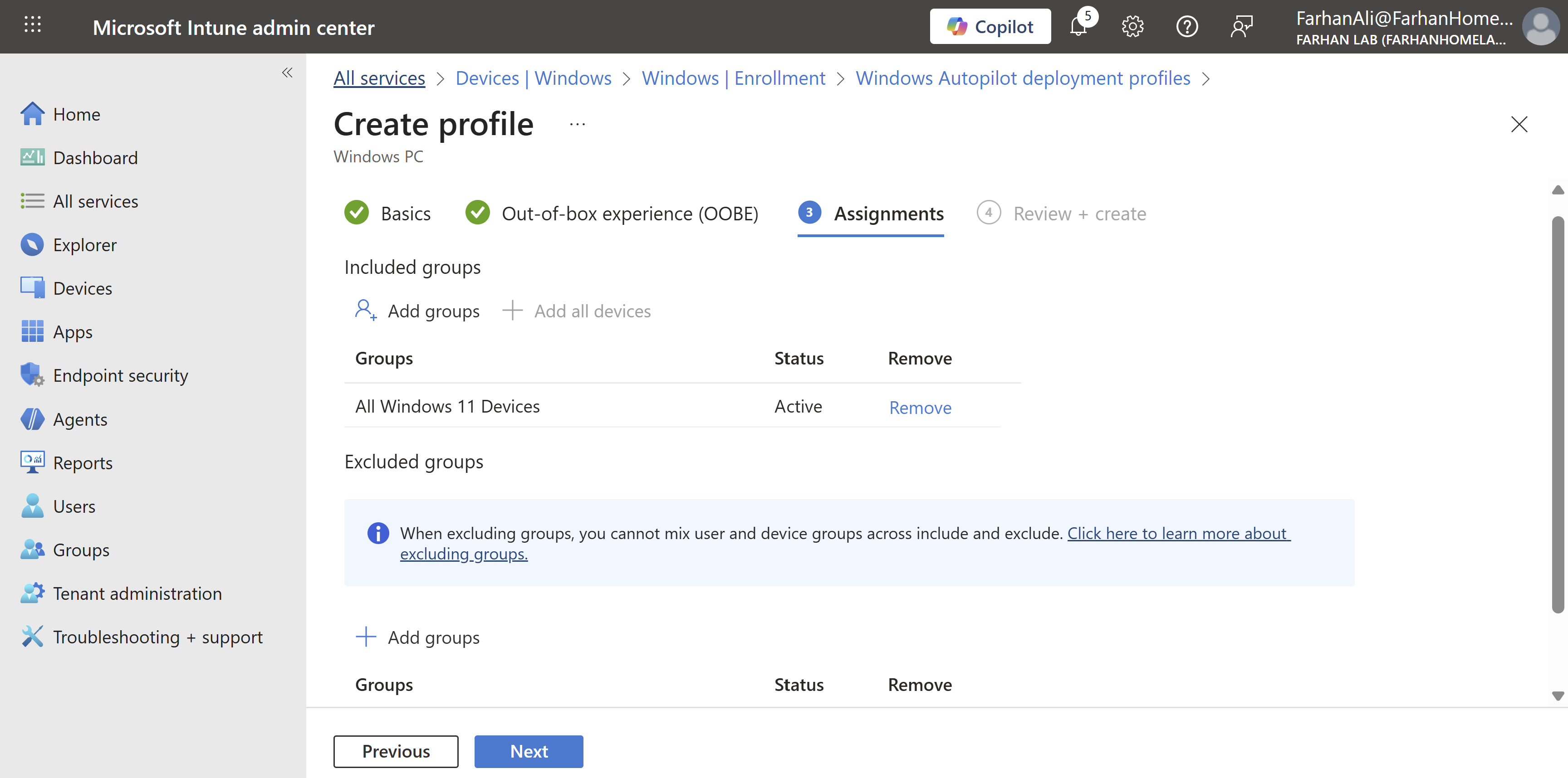I can skip this step for my lab but it’s important to note that Windows Autopilot device preparation relies on several different types of services to function properly so it’s important to ensure proper network configuration for these services: Windows Autopilot device preparation requirements