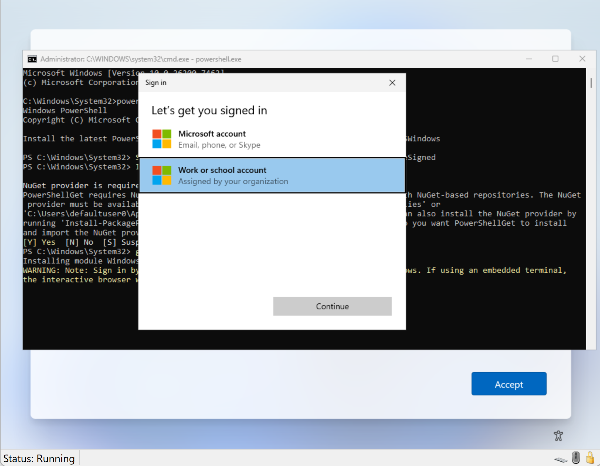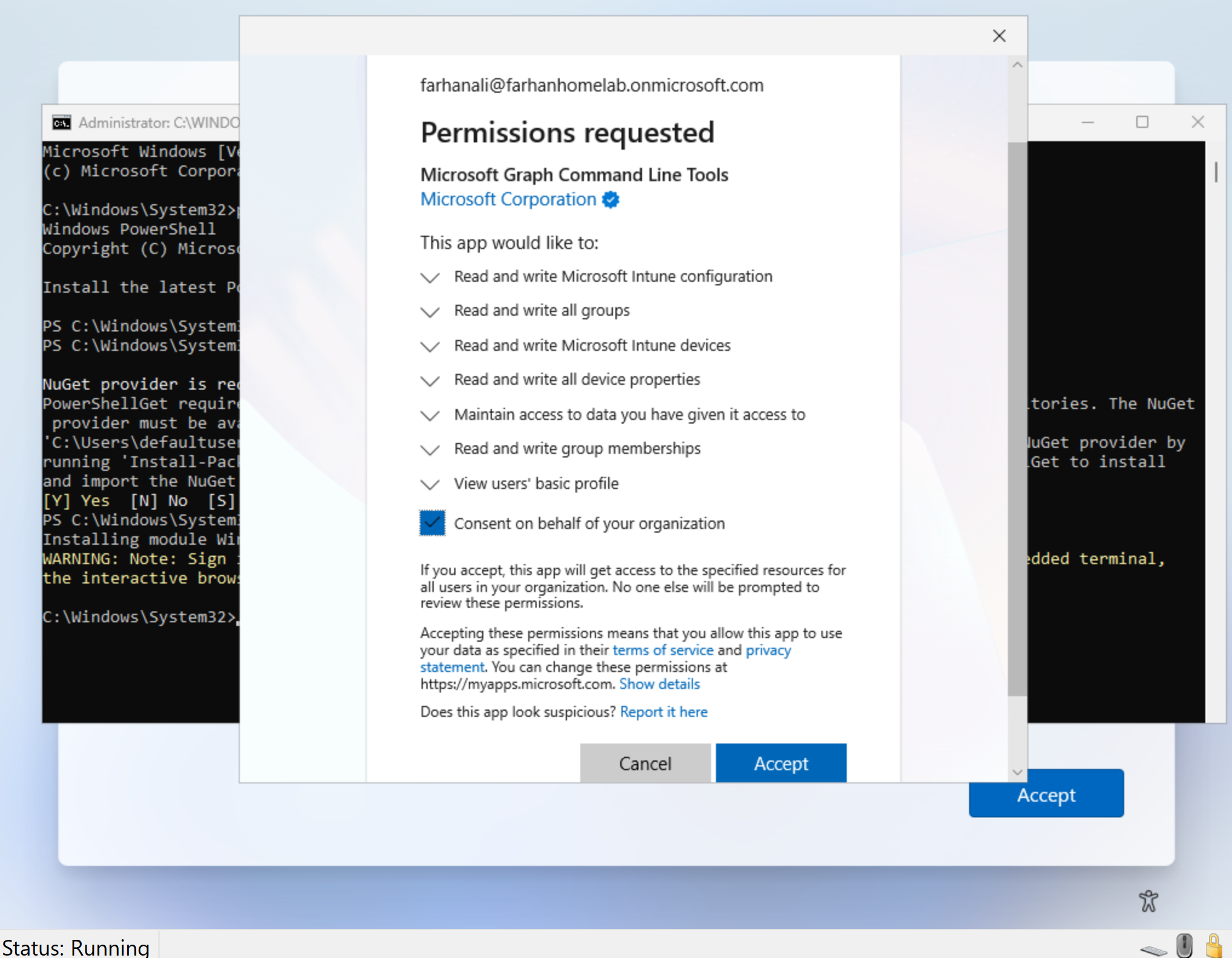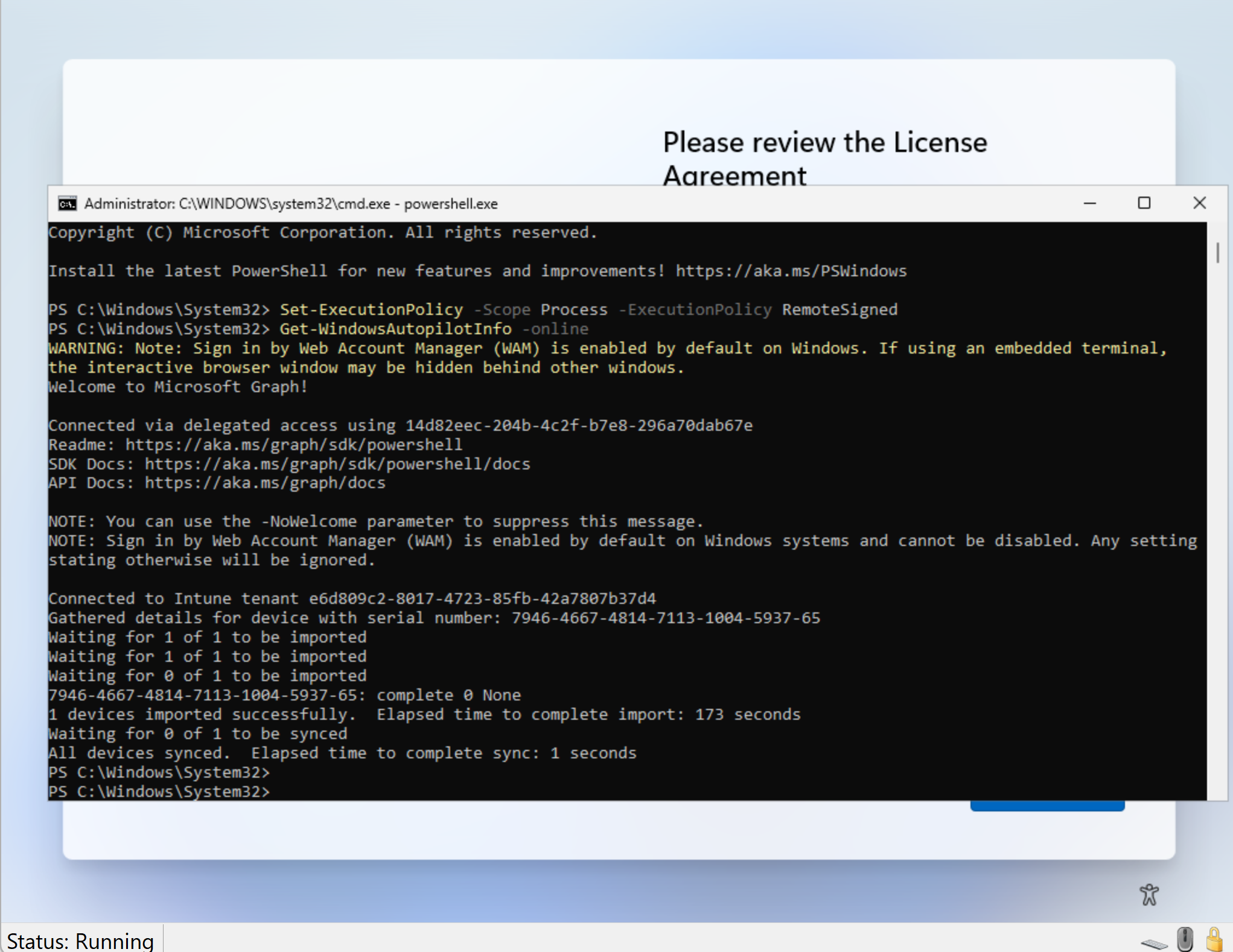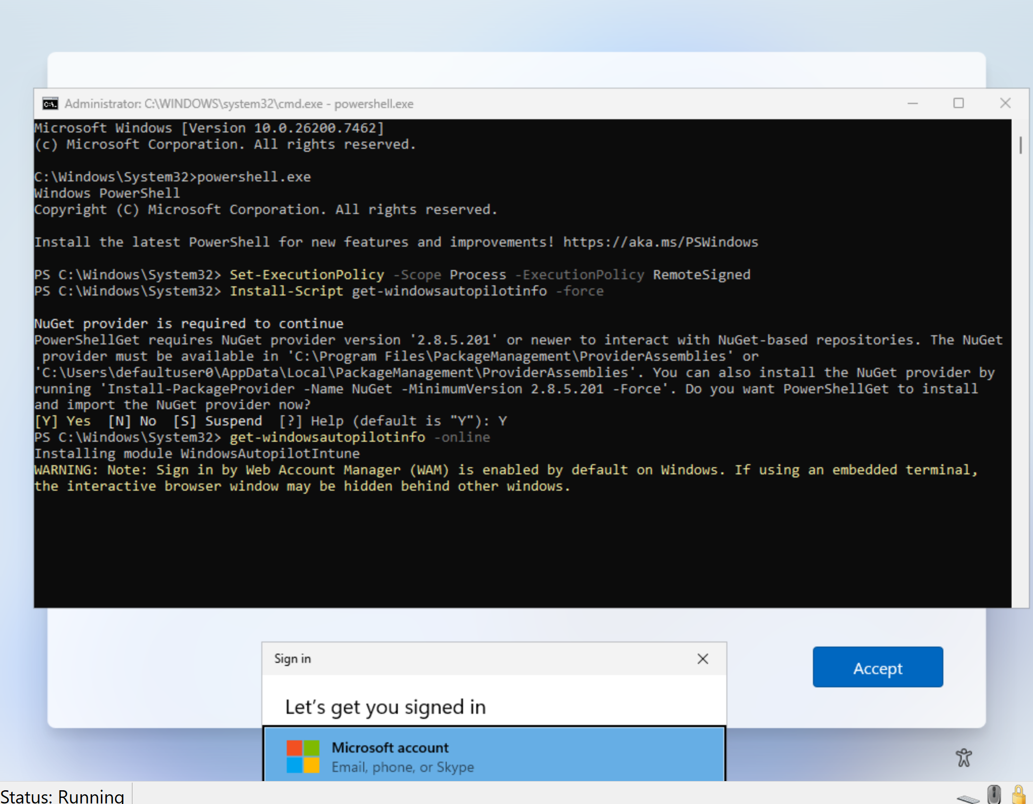 Since this is the first device registration using the PowerShell method, the Microsoft Graph will prompt for consent to the required permissions. Provide consent by clicking Accept so that the Microsoft Graph command-line tools and scripts can interact with the Autopilot service.