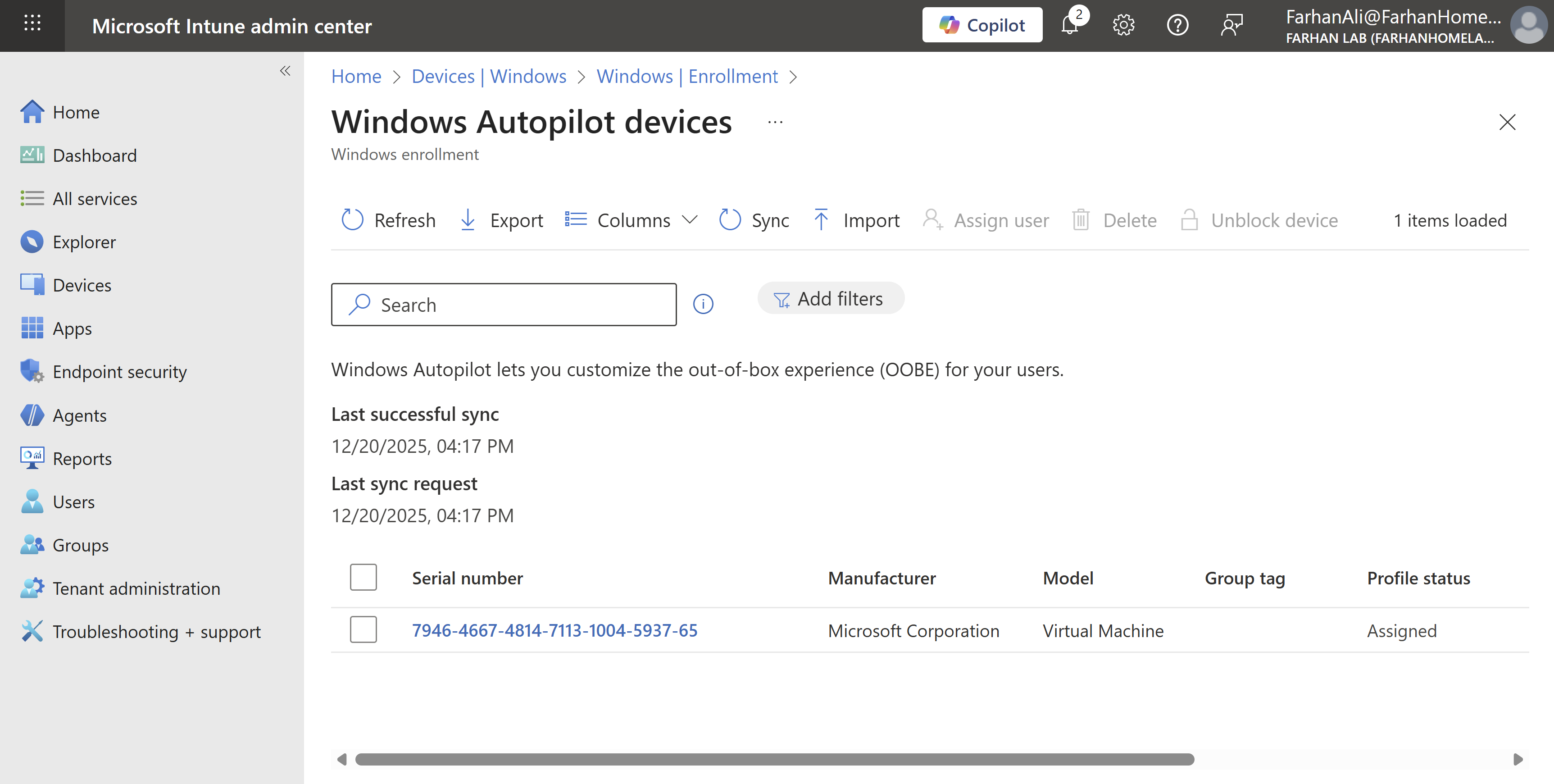 After uploading the hash, navigate to Microsoft Intune admin center -> Devices -> Windows -> Enrollment -> Devices under Windows Autopilot to verify deployment profile assignment.