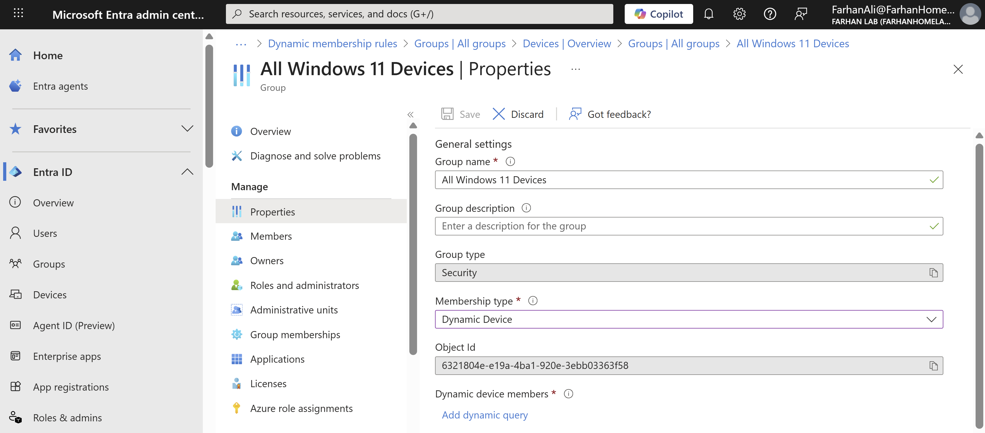 I created a dynamic device group that will later be used to define the scope for Intune assignments. The group is configured to automatically include all Windows Autopilot devices using the following dynamic membership rule: