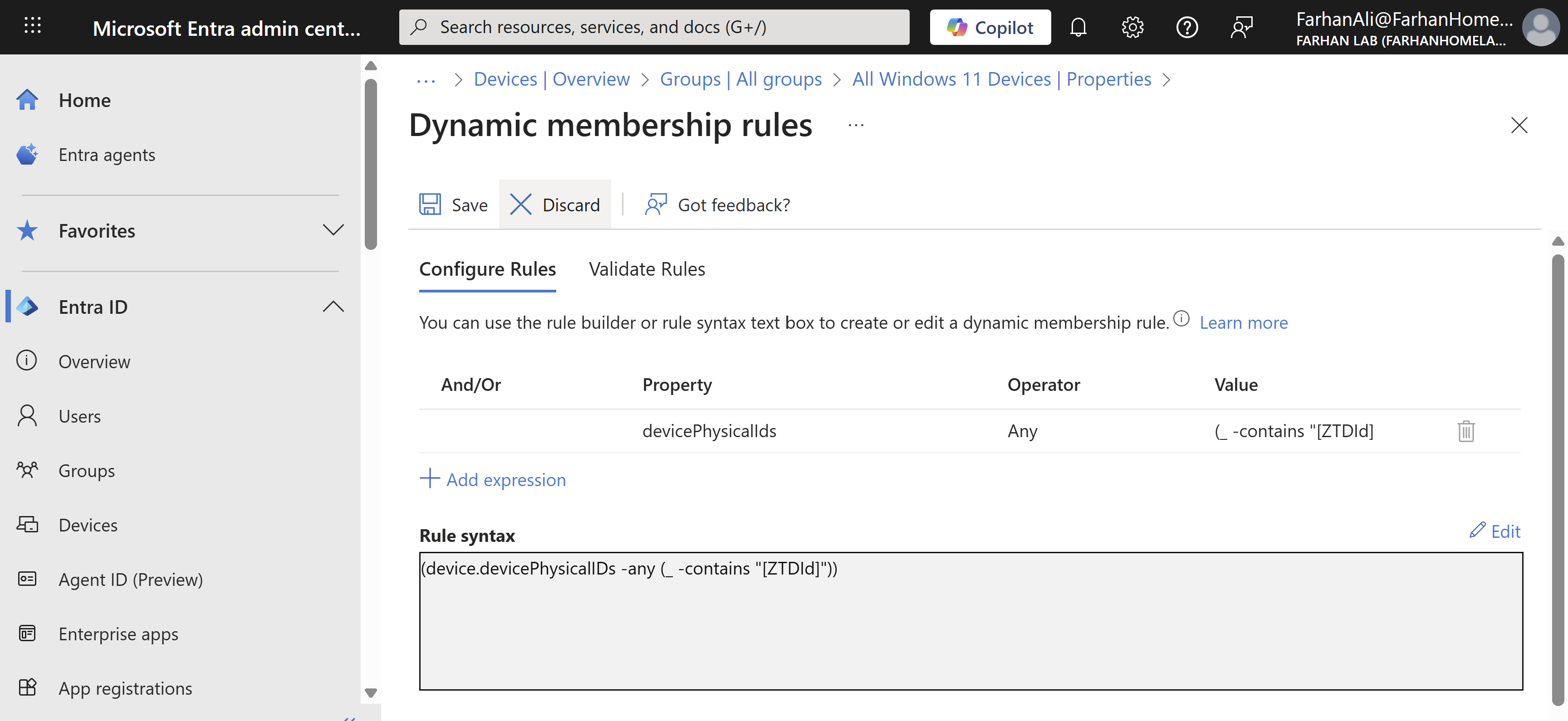 This rule adds any device that contains a ZTDId (Zero Touch Deployment ID) to the group. The ZTDId is automatically assigned by Microsoft when a device is registered with Windows Autopilot, making this a reliable way to identify all Autopilot-managed devices.