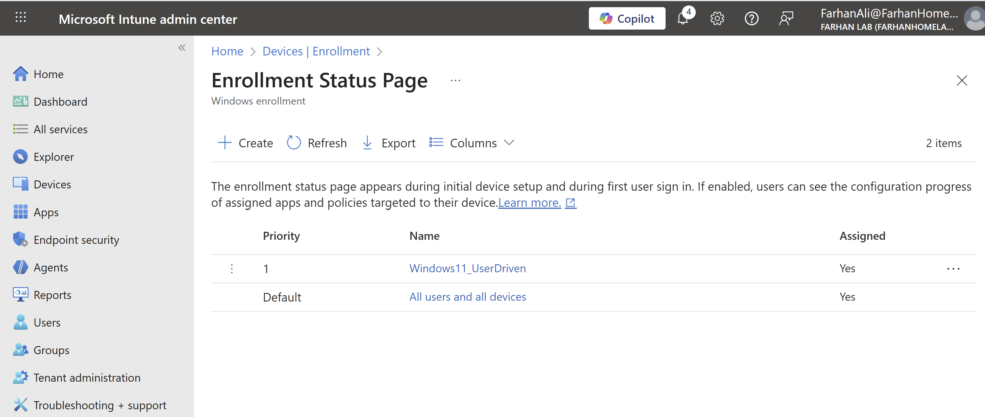Navigate to Microsoft Intune admin center → Enrollment → Enrollment Status Page under Windows Autopilot
