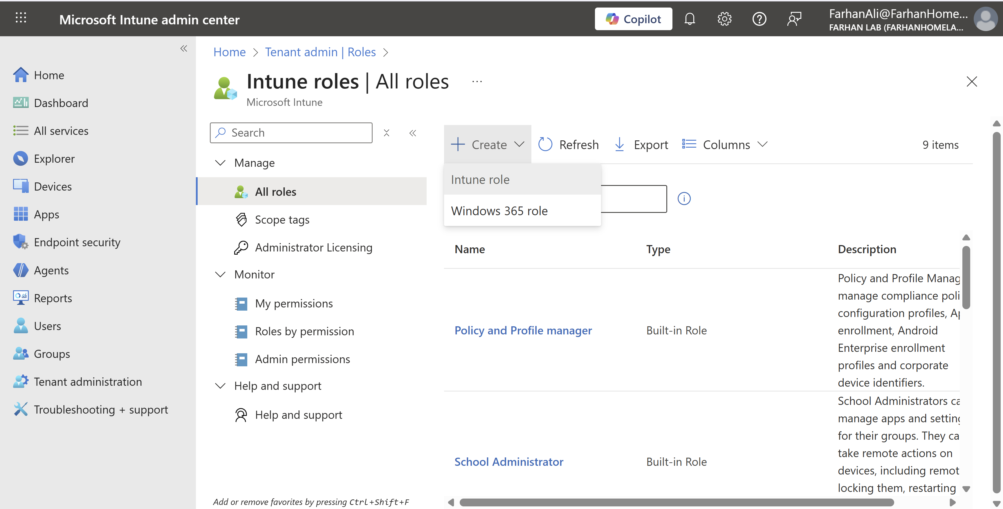 Navigate to Microsoft intune admin center -> Tenant administration -> Create -> Intune role