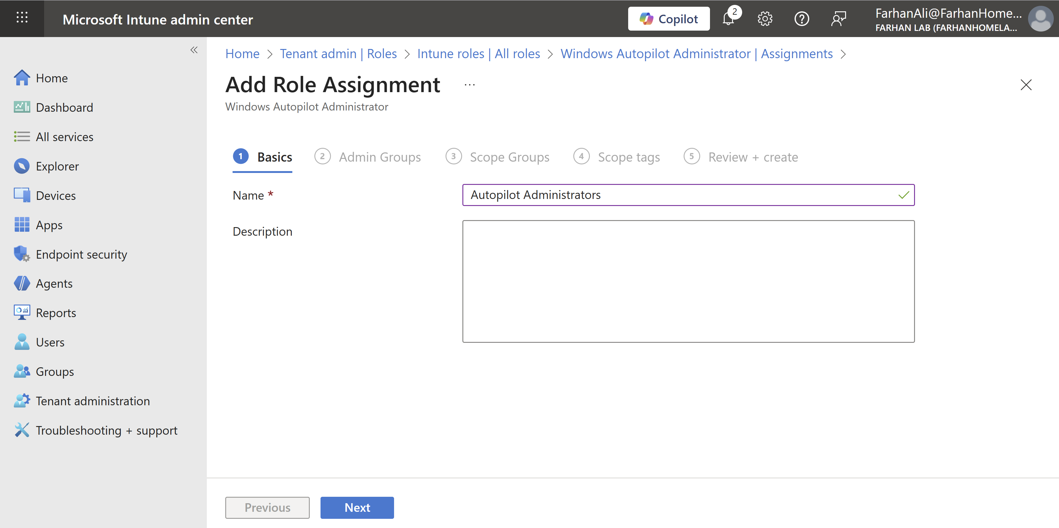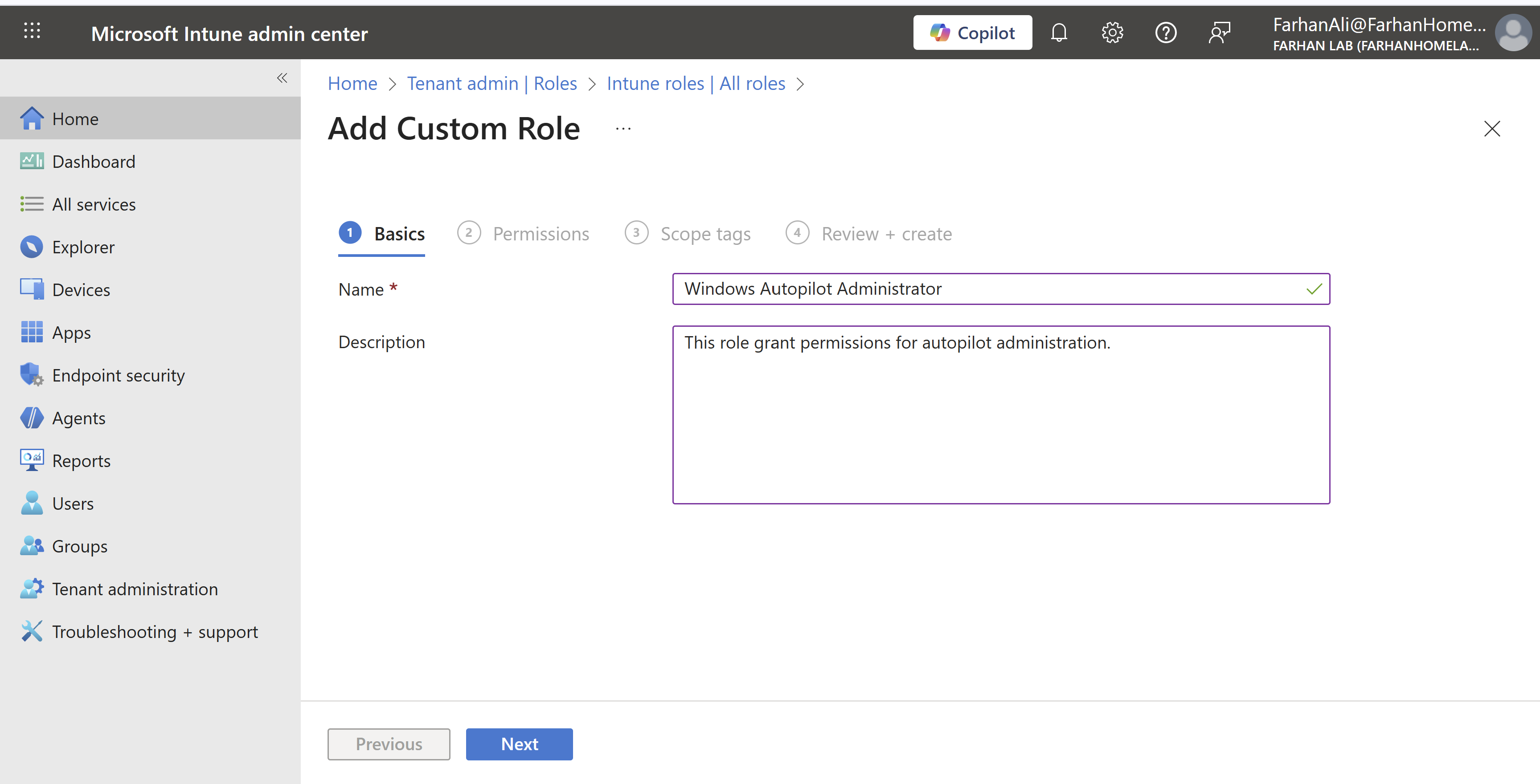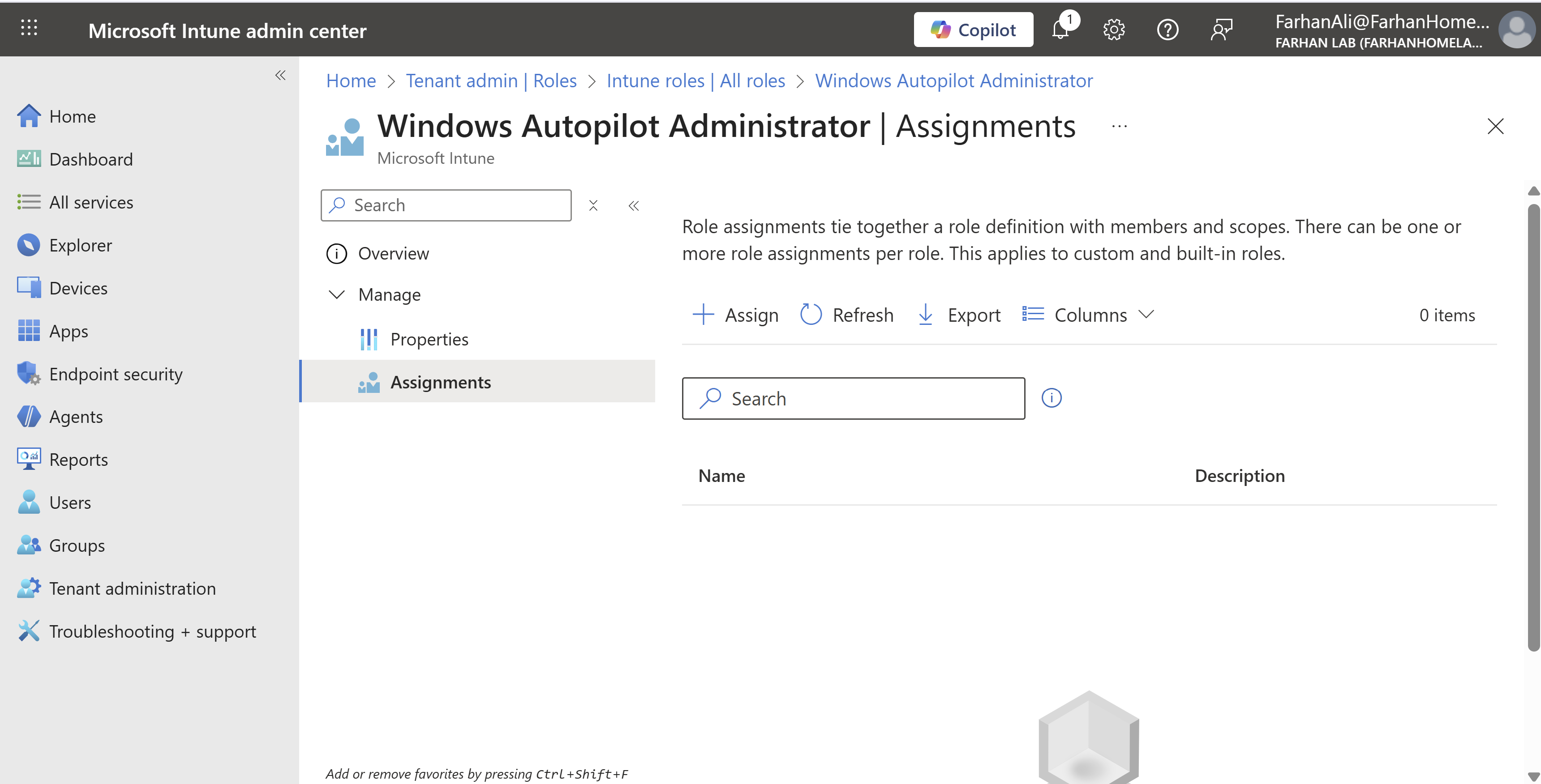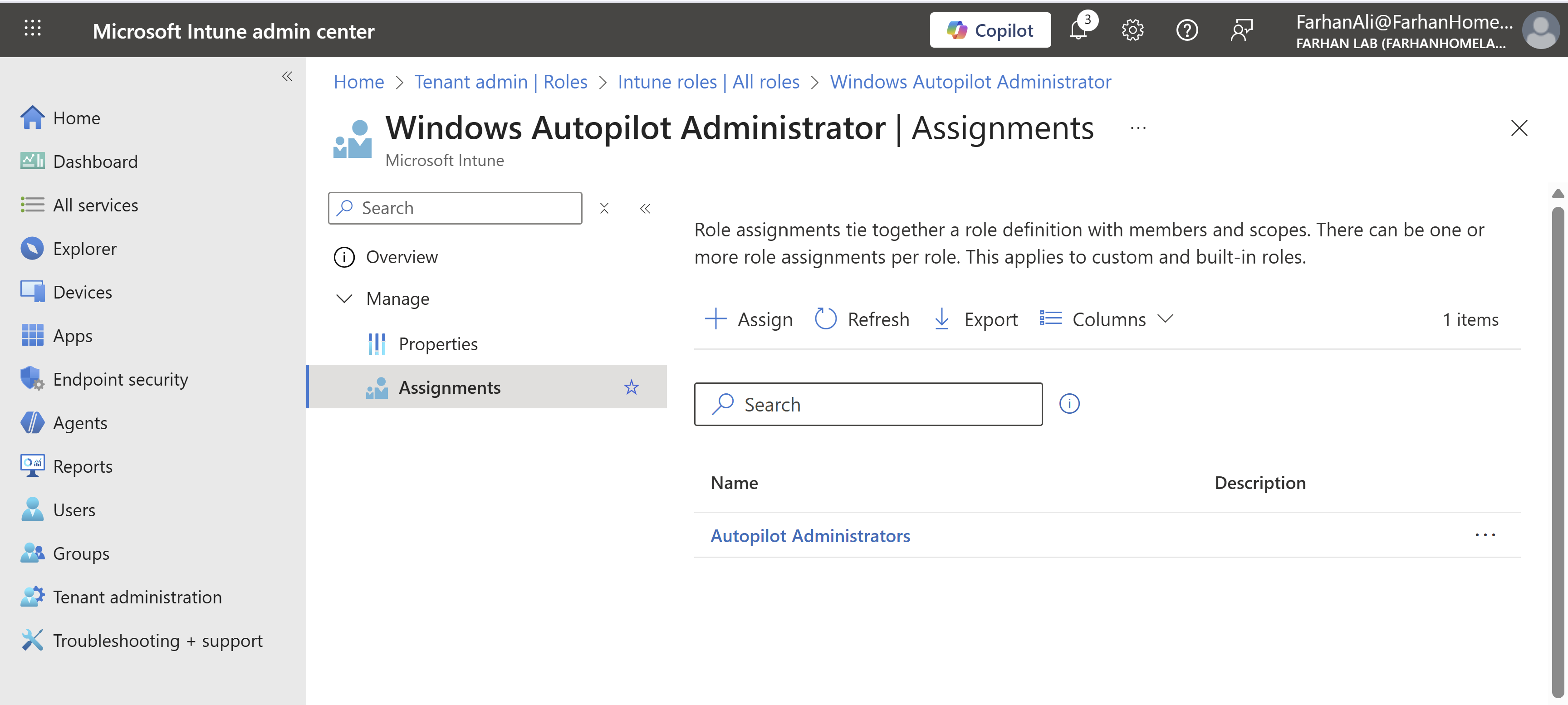 The person who signs up for Microsoft online services automatically becomes a Global admin which has unlimited access to all management features and most data in all admin centers. Now this is harmless in a lab environment but in an enterprise environment you should create a custom role following the least privilege method for windows autopilot administrator which is what I will do.