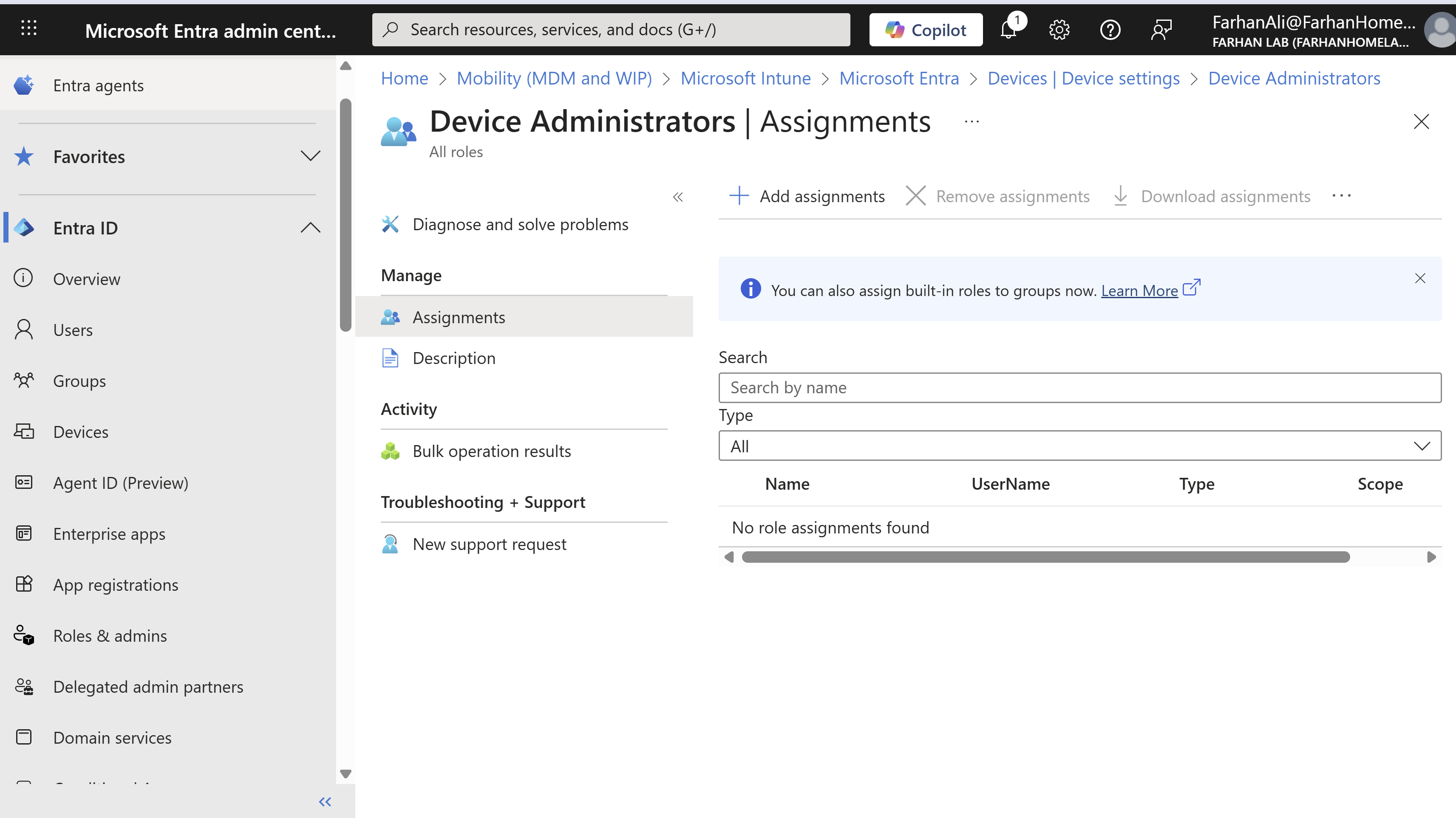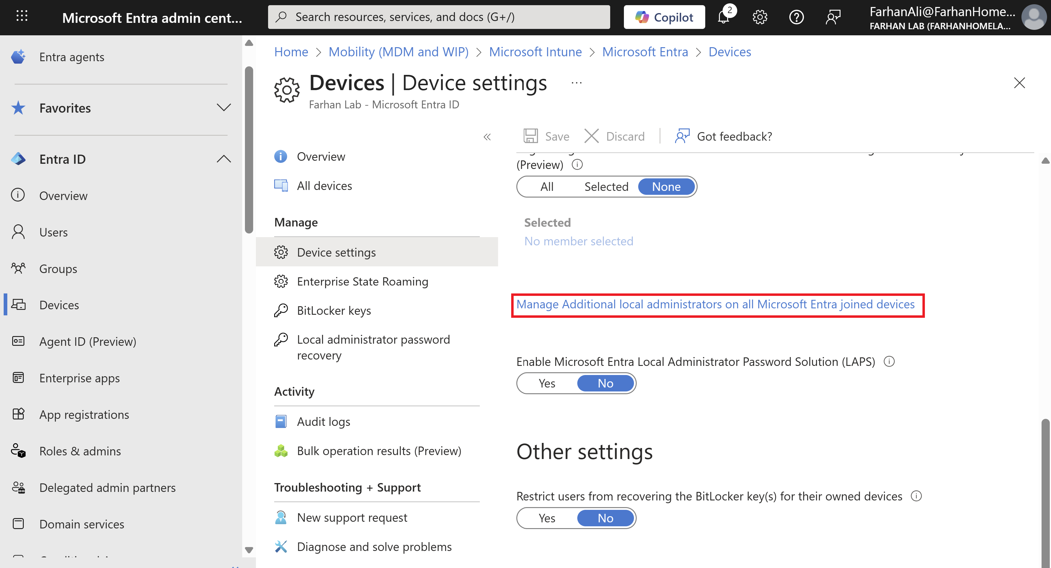 Navigate to Microsoft Entra admin center → Entra ID → Devices → Device Settings -> “Manage Additional local administrators on all Microsoft Entra joined devices”