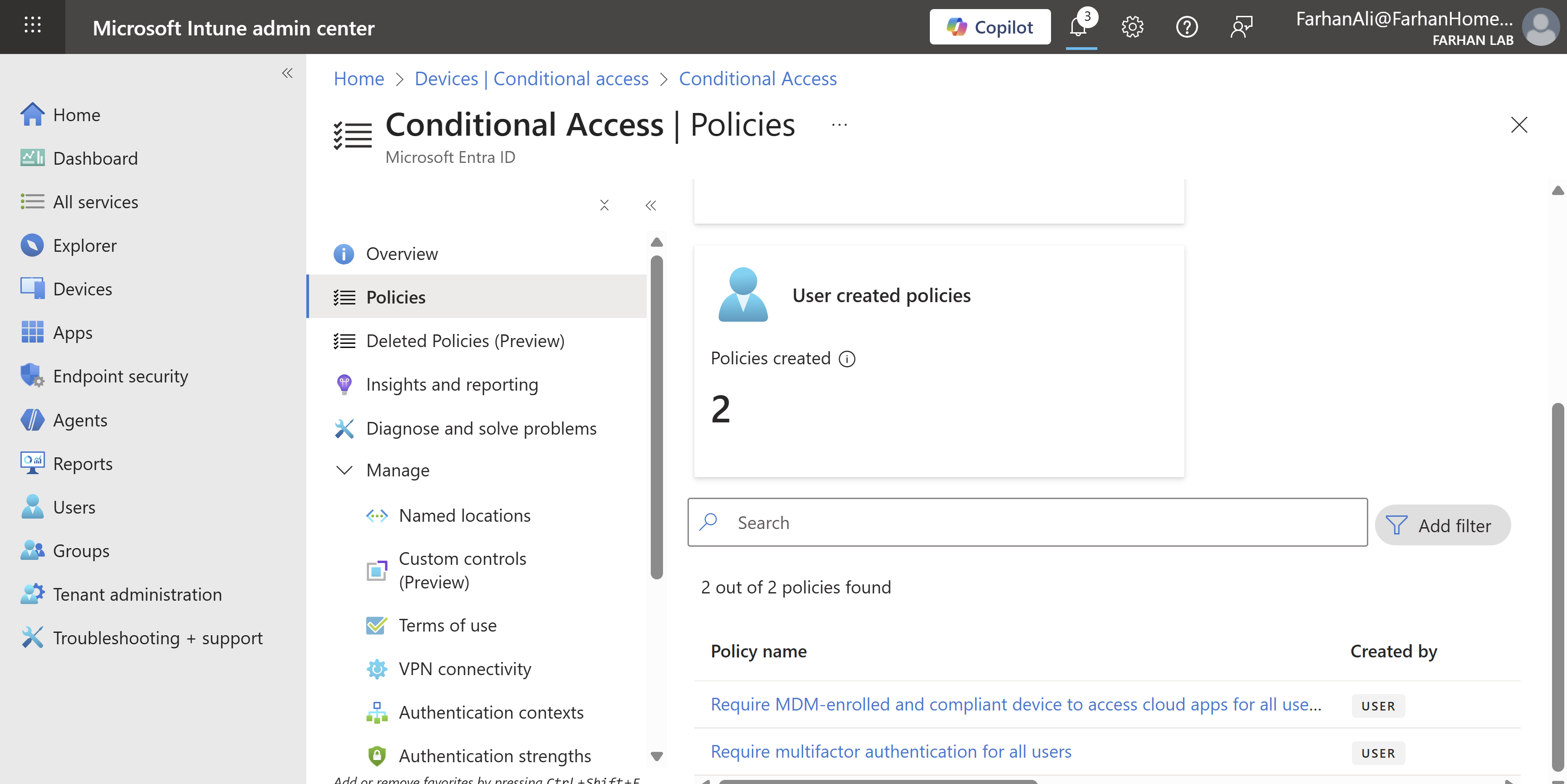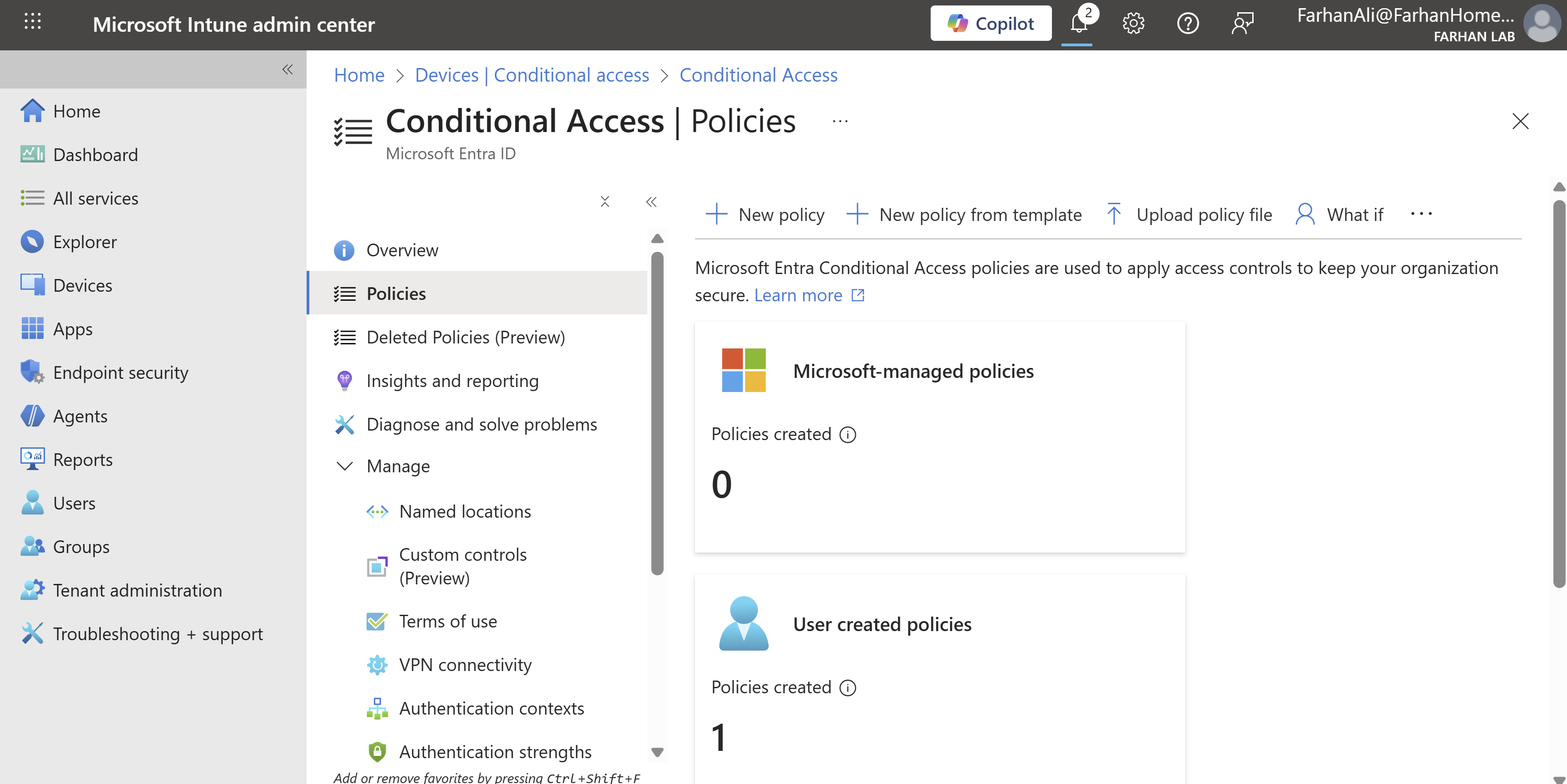 Navigate to Microsoft Intune admin center → Devices → Conditional Access → Policies