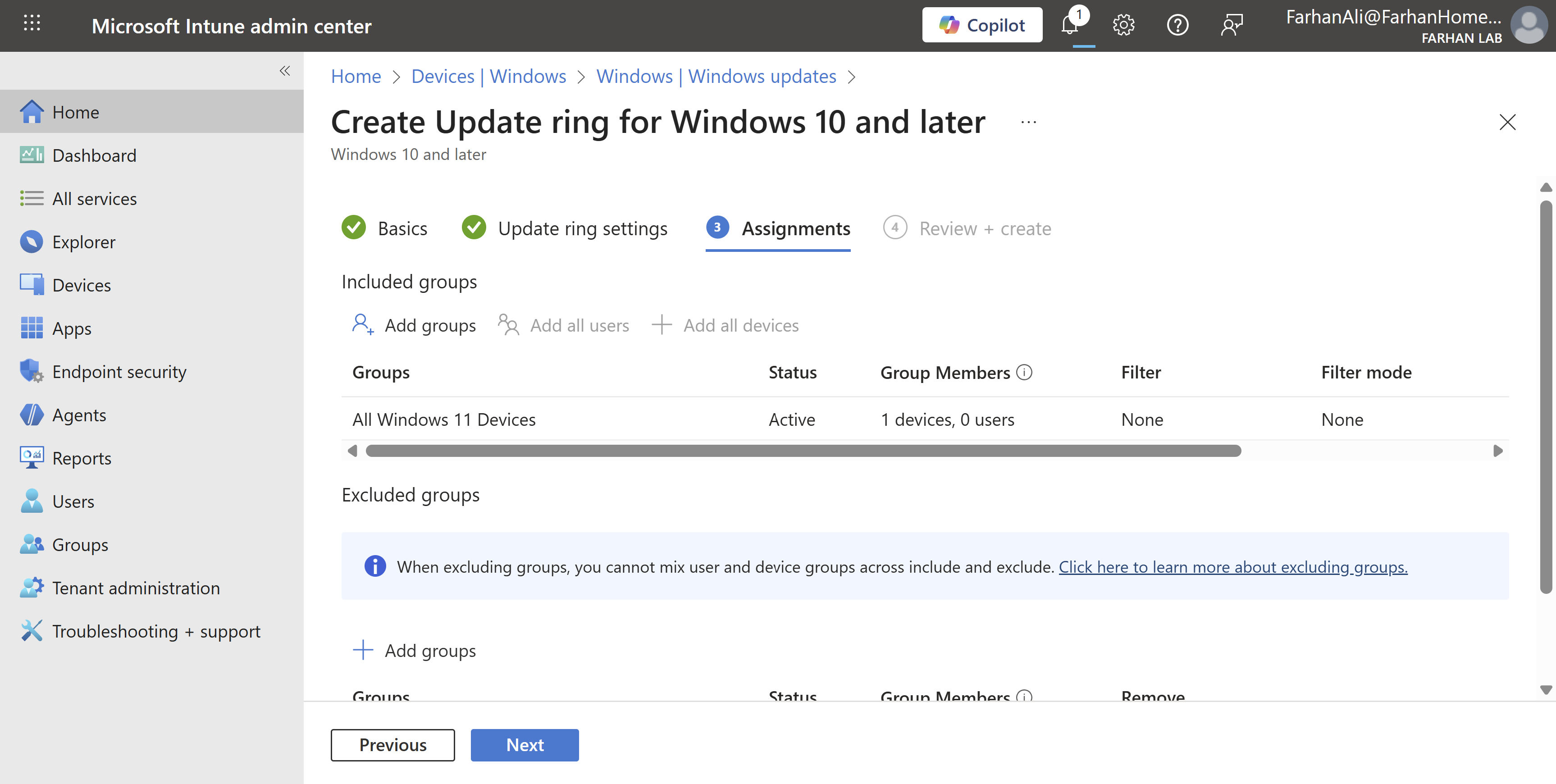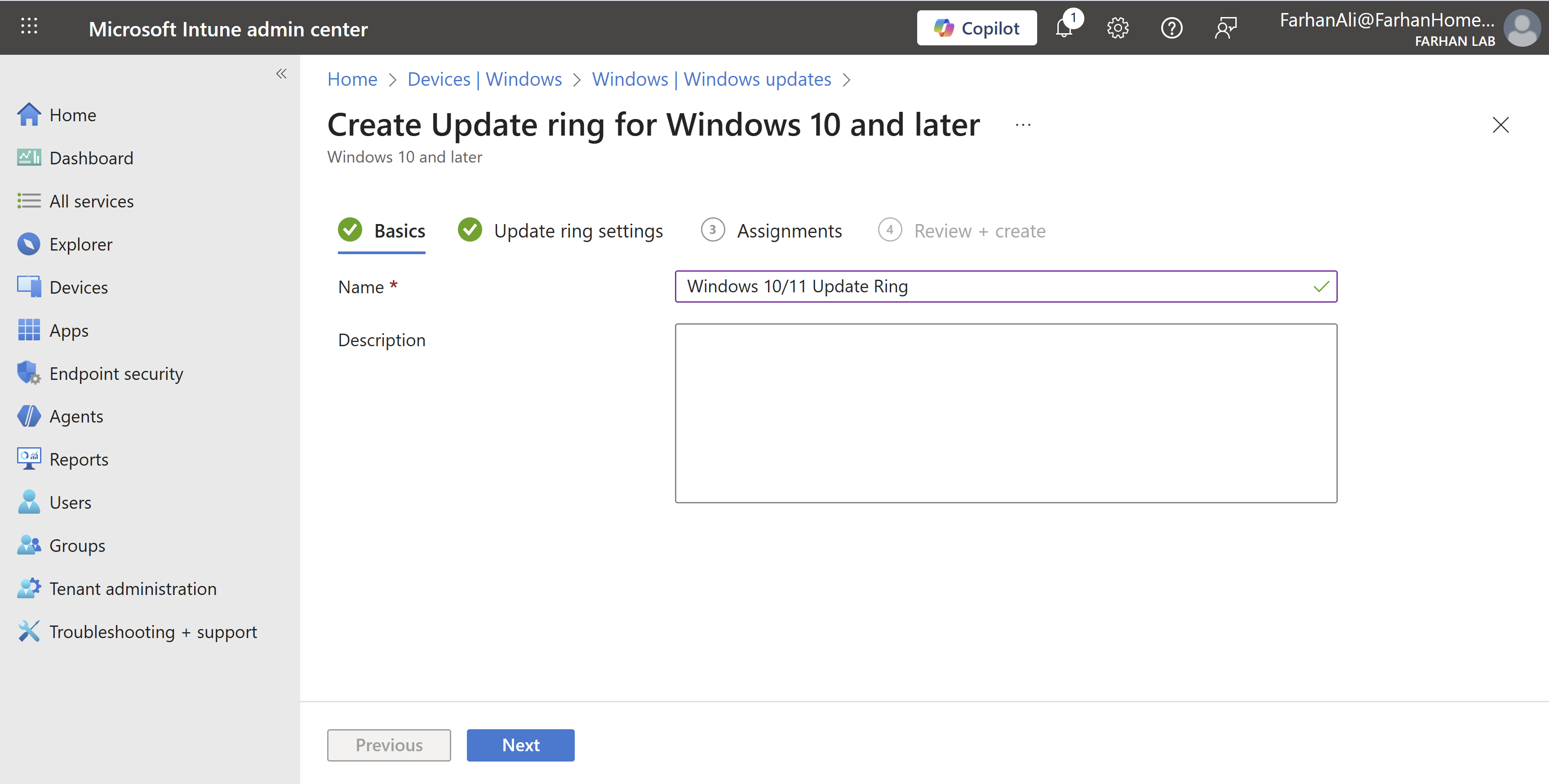 Created an update ring profile and named it Windows 10/11 Update Ring