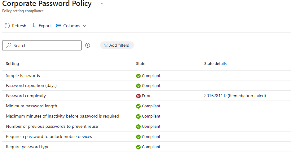 Upon reviewing the compliance details, I noticed that the Corporate Password Policy was flagged as Noncompliant because the password complexity requirements were not met.