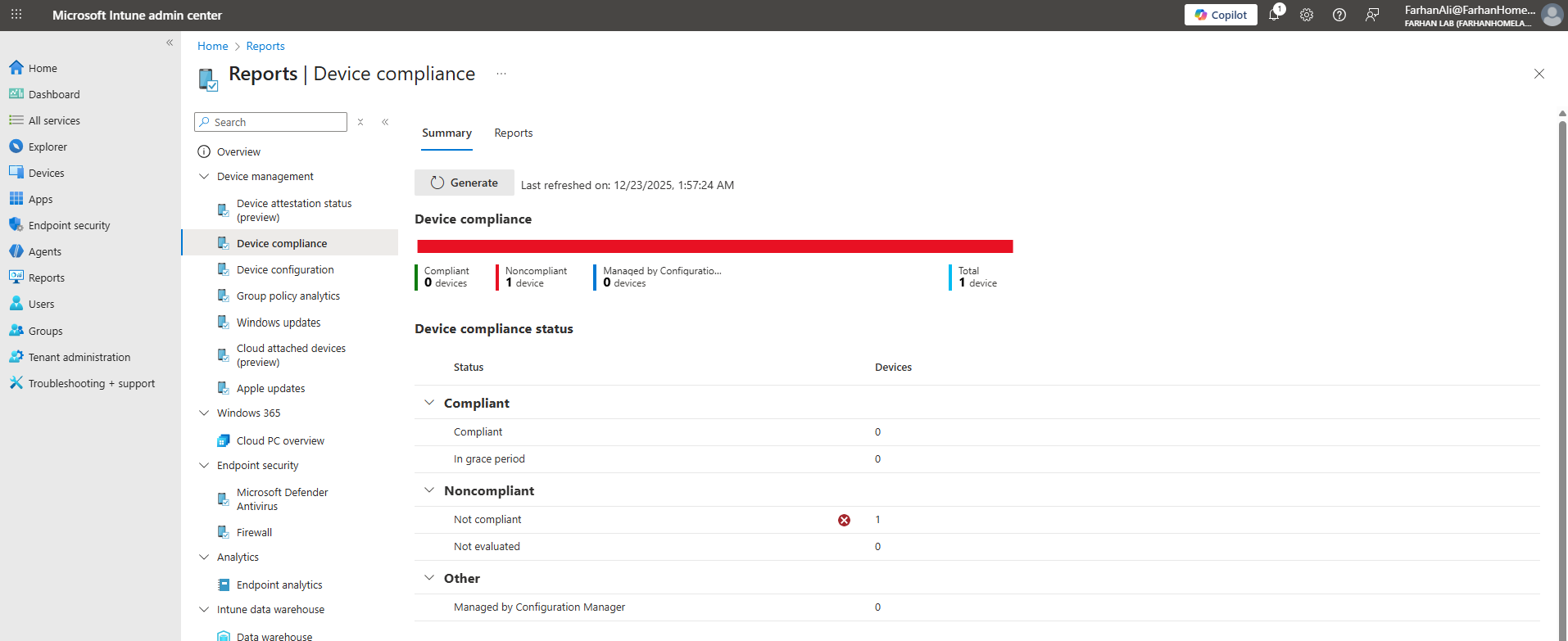 Click Generate to produce a compliance report and verify the device’s compliance status. I noticed that the device is marked as noncompliant.